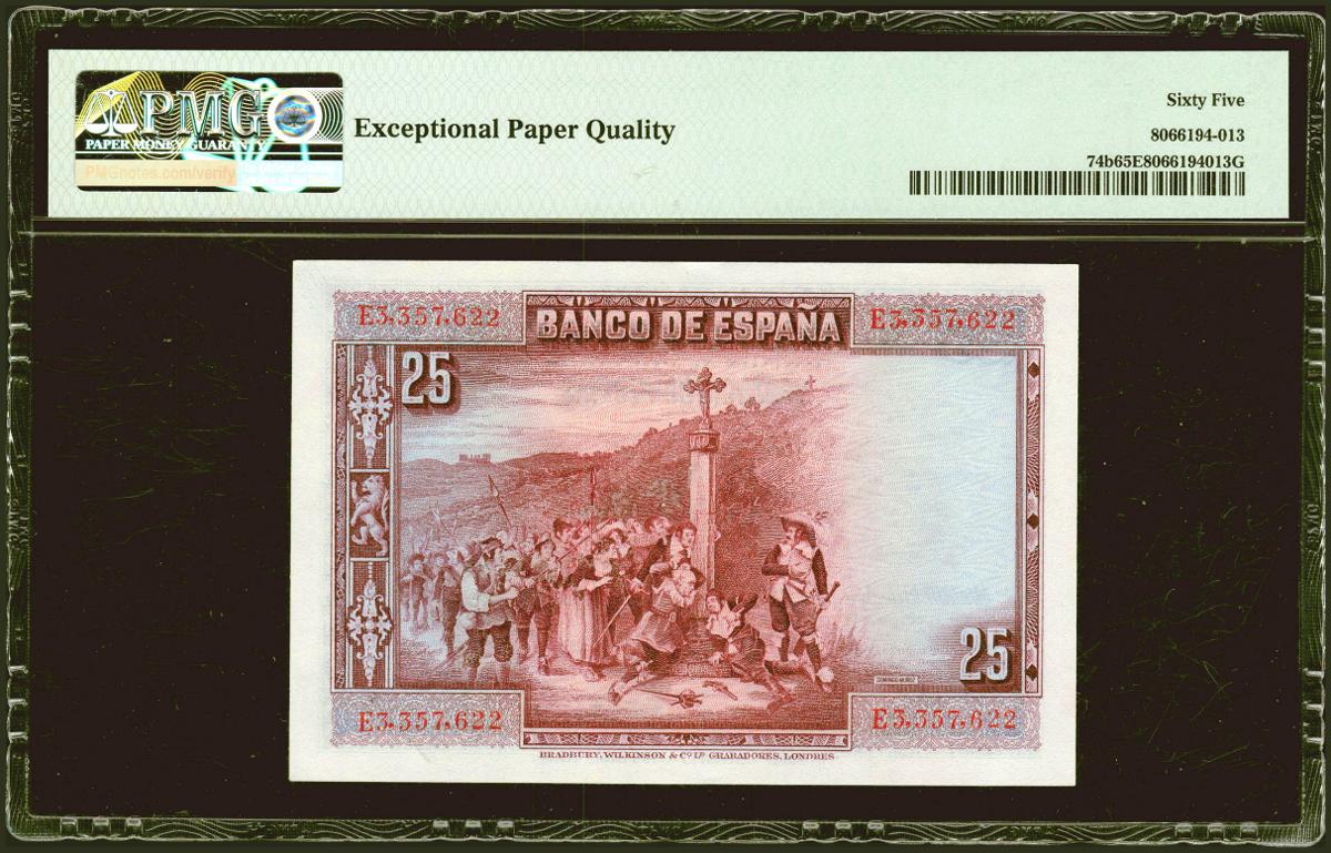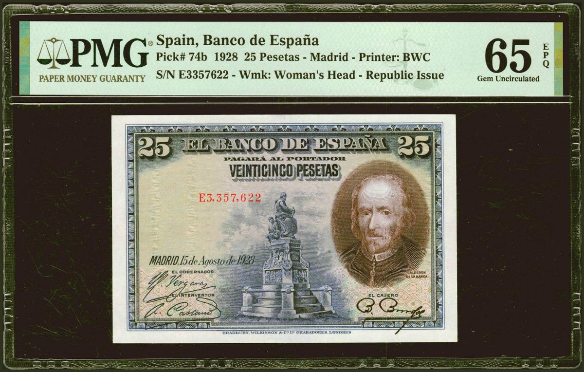 25 Pesetas. 15 de Agosto de 1928. Serie E. (Edifil 2021: 353, Pick: 74b). Apresto original. SC. Encapsulado PMG65EPQ.