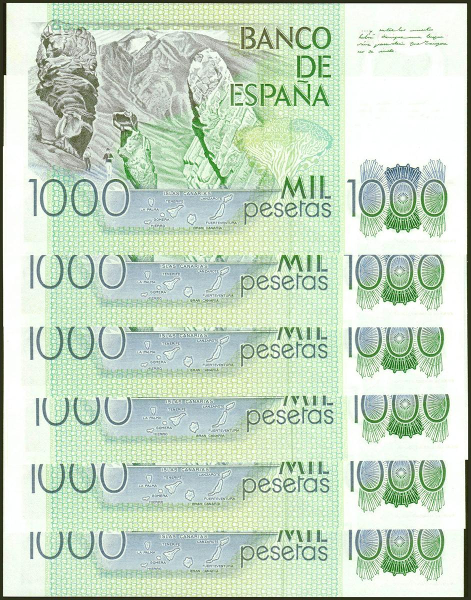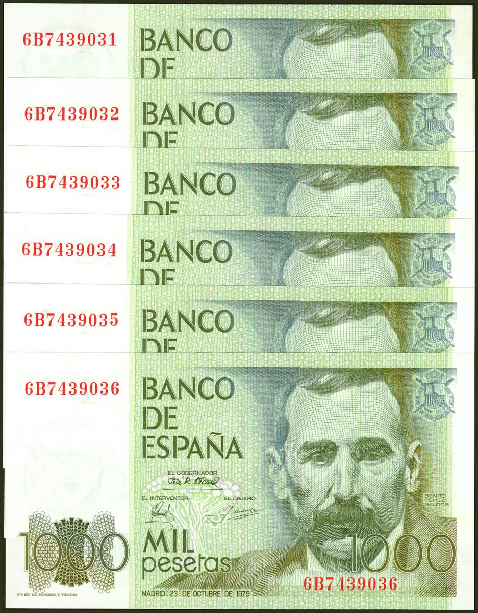Conjunto de 6 billetes correlativos de 1000 Pesetas, emitidos el 23 de Octubre de 1979, todos ellos con la serie 6B (Edifil 2021: 477a), con ondulaciones naturales del proceso de fabricación (este es el único motivo de "quitarle" el SC) EBC+++.