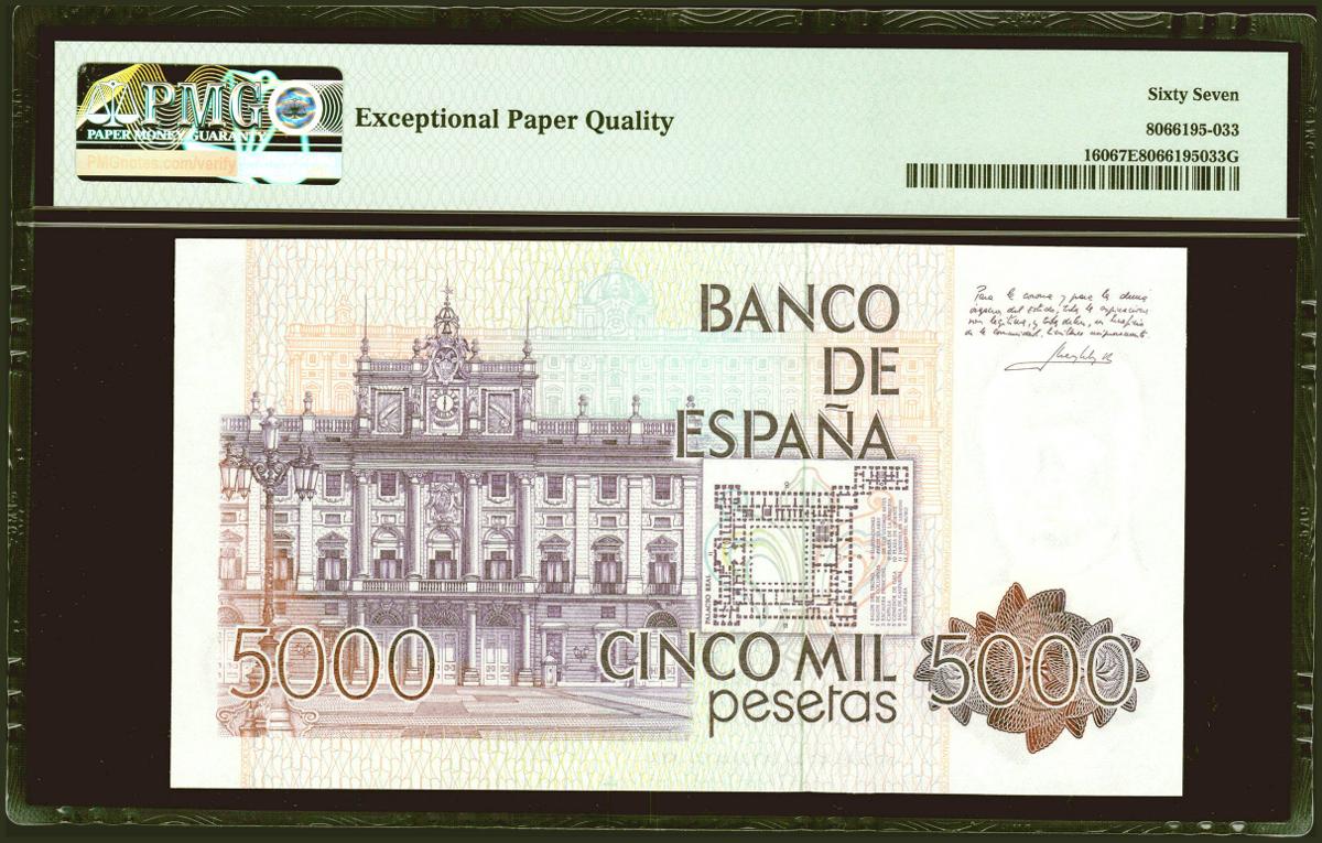 5000 Pesetas. 23 de Octubre de 1979. Sin serie. (Edifil 2021: 478, Pick: 160). Inusual en esta excepcional calidad. SC. Encapsulado PMG67EPQ.