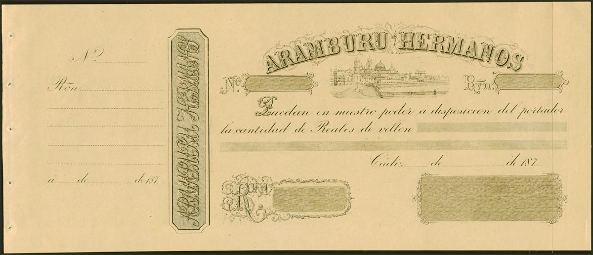(187_ca). Aramburu Hermanos, Cádiz (Recibo). Para entender mejor la contextualización de este Banco recomendamos la obra "Obligaciones, vales y documentos puestos en circulación como papel moneda en España", de Don Ramón Cobo Huici. SC--.