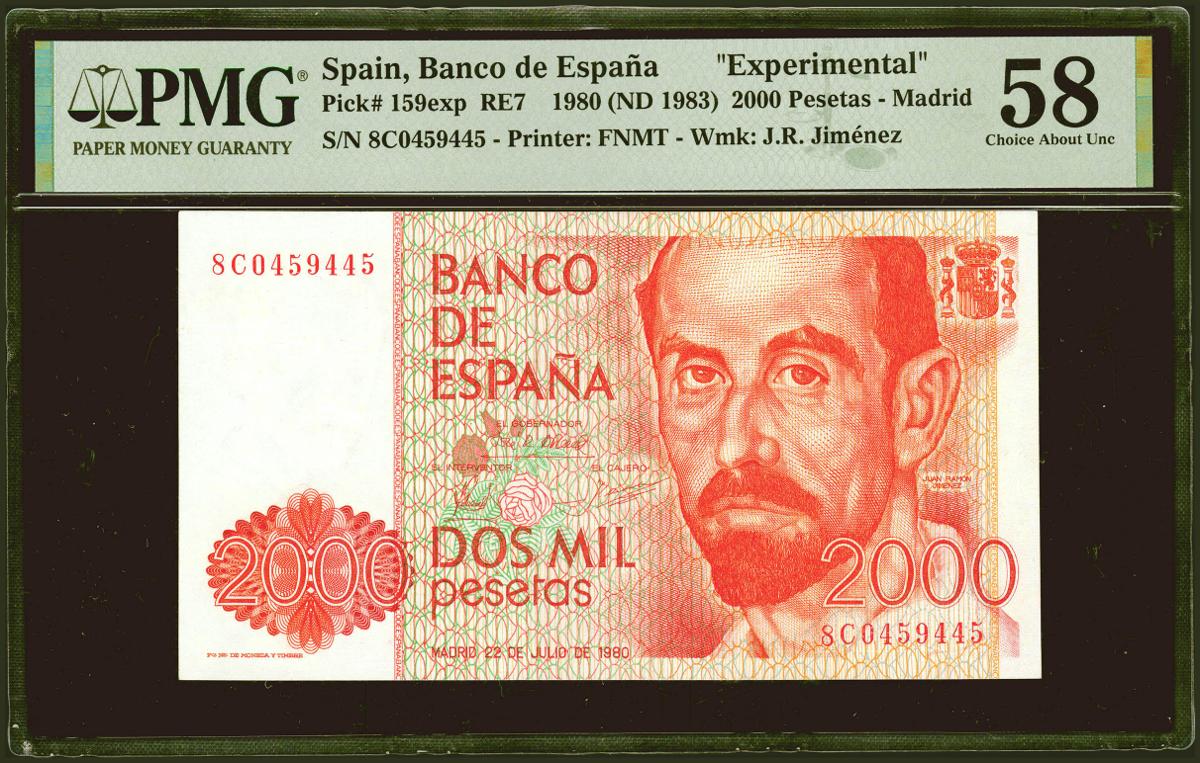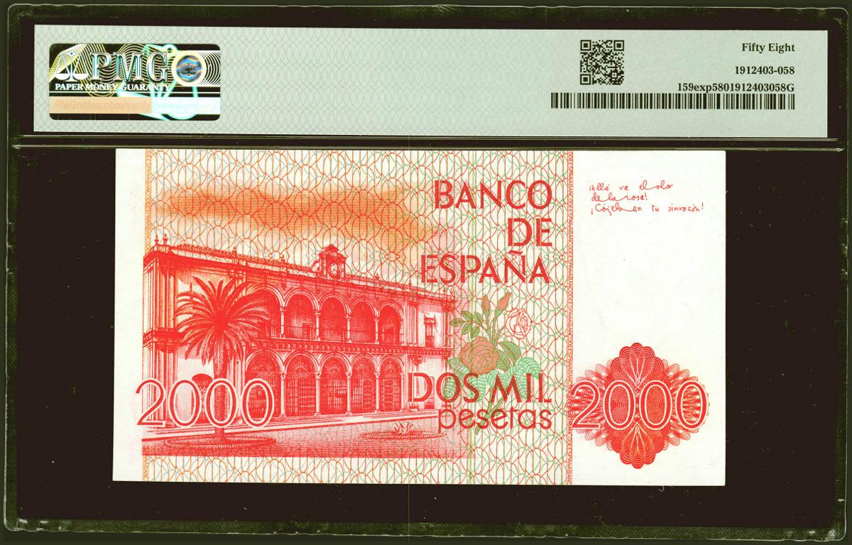 2000 Pesetas. 22 de Julio de 1980. Serie especial 8C. (Edifil 2021: 479c, Pick: 159exp). Extraordinariamente rara serie, para hacernos una idea de su rareza con la información estadística que disponemos nos atrevemos a afirmar que se trata, al menos, de una rareza tan importante como la serie 9B de Rosalía de Castro. EBC++. Encapsulado PMG58.