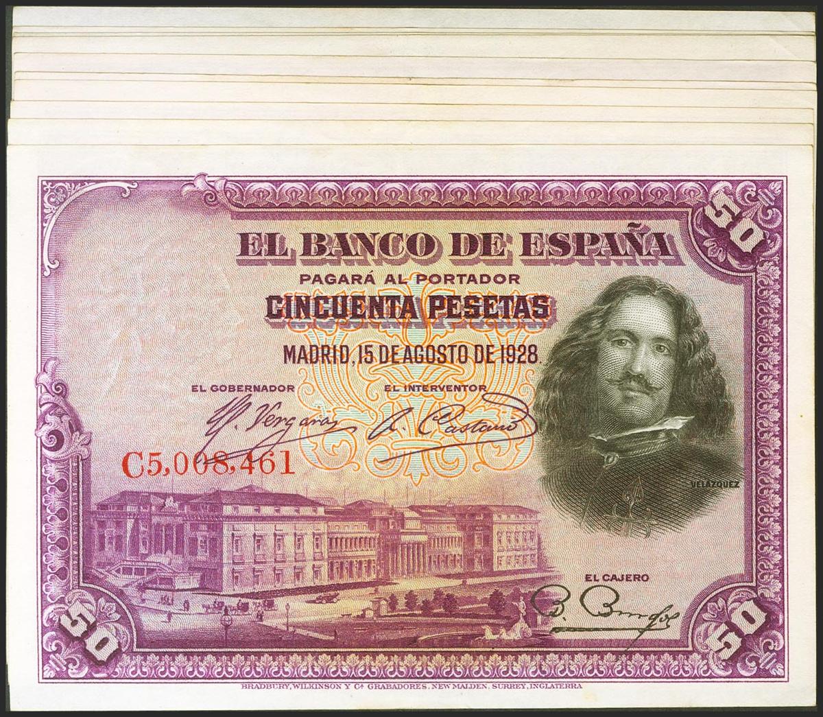 Conjunto de 10 billetes correlativos y en diferentes tramos de 50 Pesetas emitidos el 15 de Agosto de 1928 y con la serie C (Edifil 2021: 354), conservando la mayor parte del apresto original. EBC+.