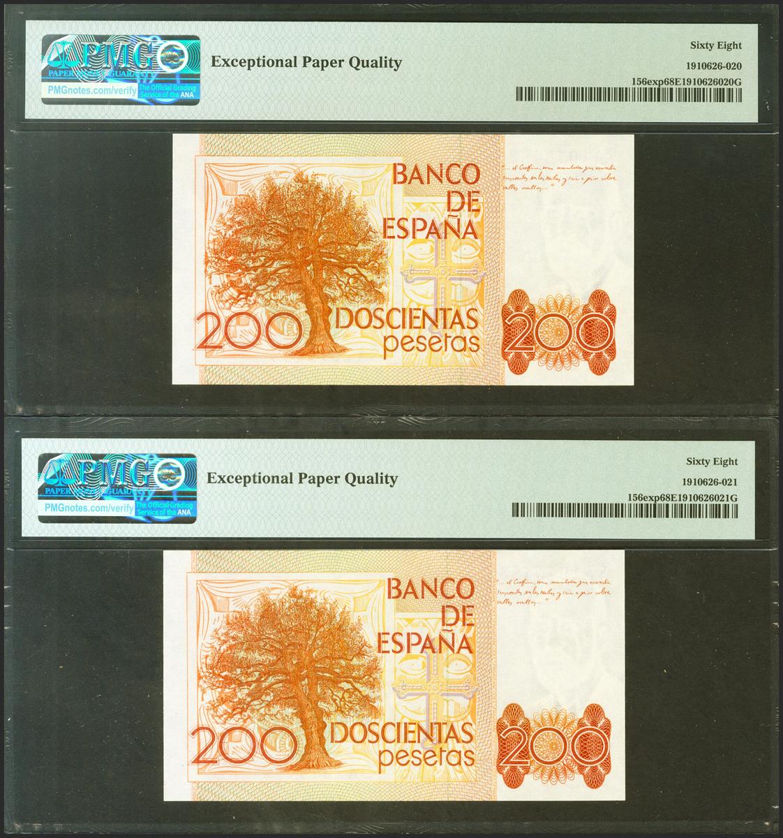 200 Pesetas. 16 de Septiembre de 1980. Pareja correlativa. Serie especial 8A. (Edifil 2021: 480c, Pick: 156exp). Extraordinariamente rara en esta excepcional calidad, apresto original. SC. Encapsulado PMG68EPQ, ambos.