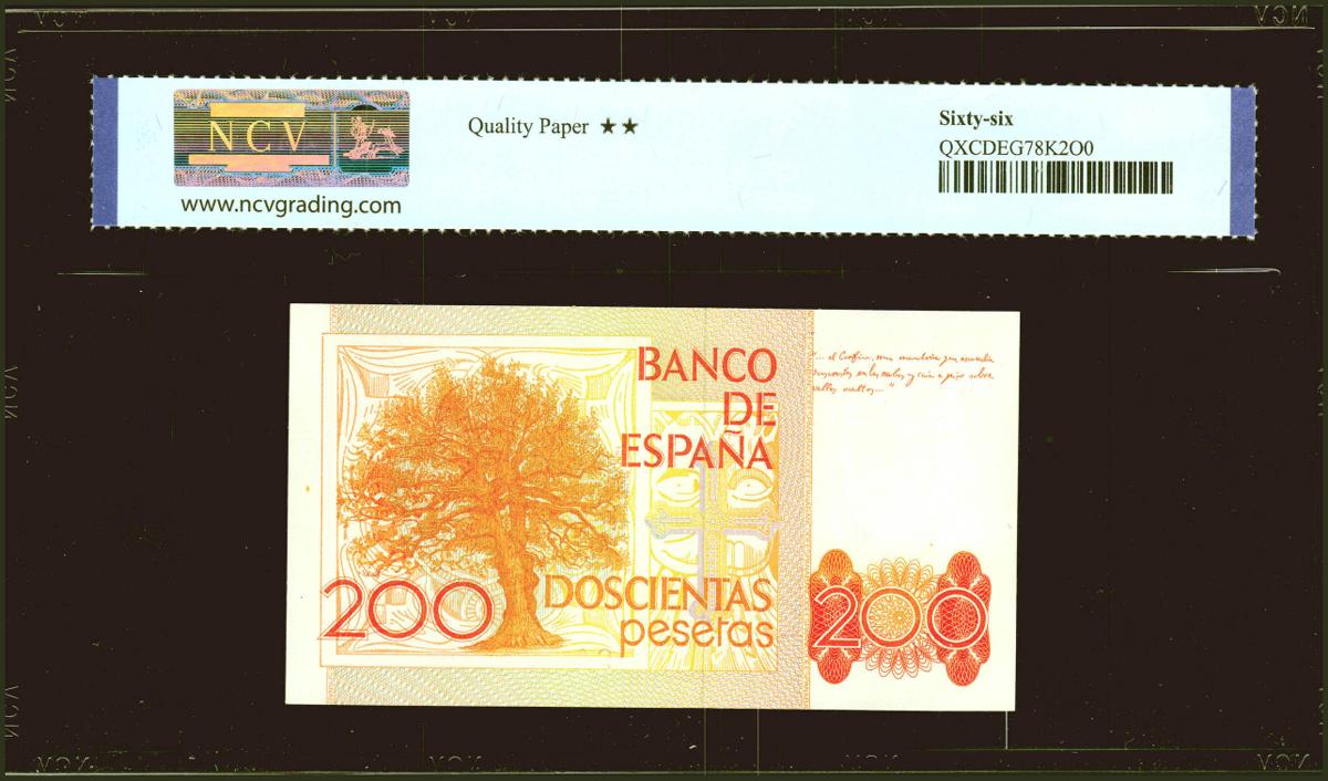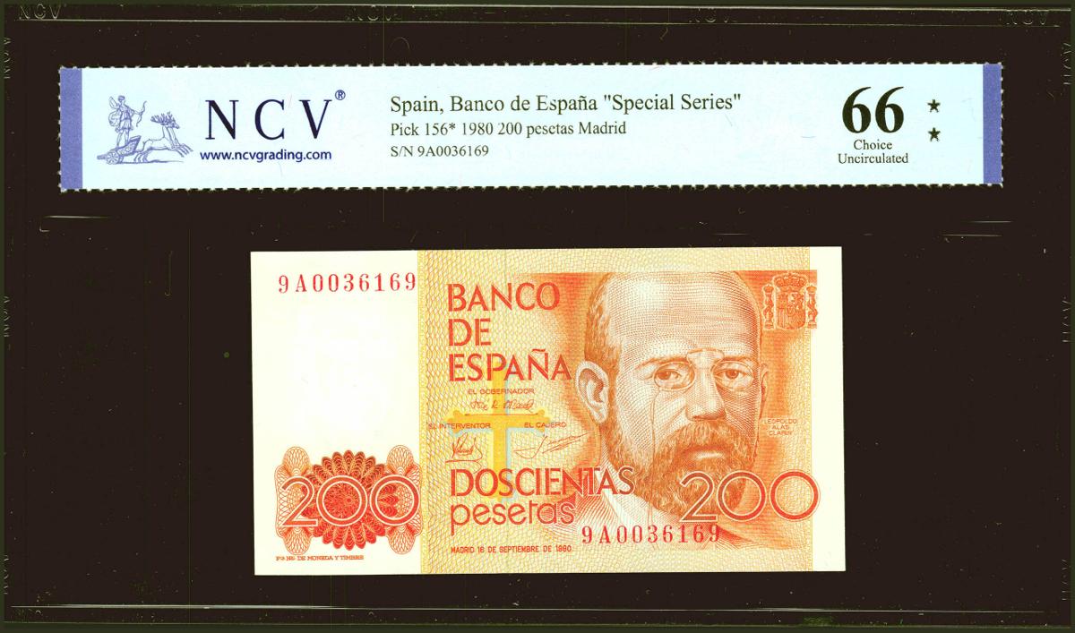 200 Pesetas. 16 de Septiembre de 1980. Serie especial 9A. (Edifil 2021: 480b, Pick: 156*). Inusual en esta excepcional calidad. SC. Encapsulado NCV66.