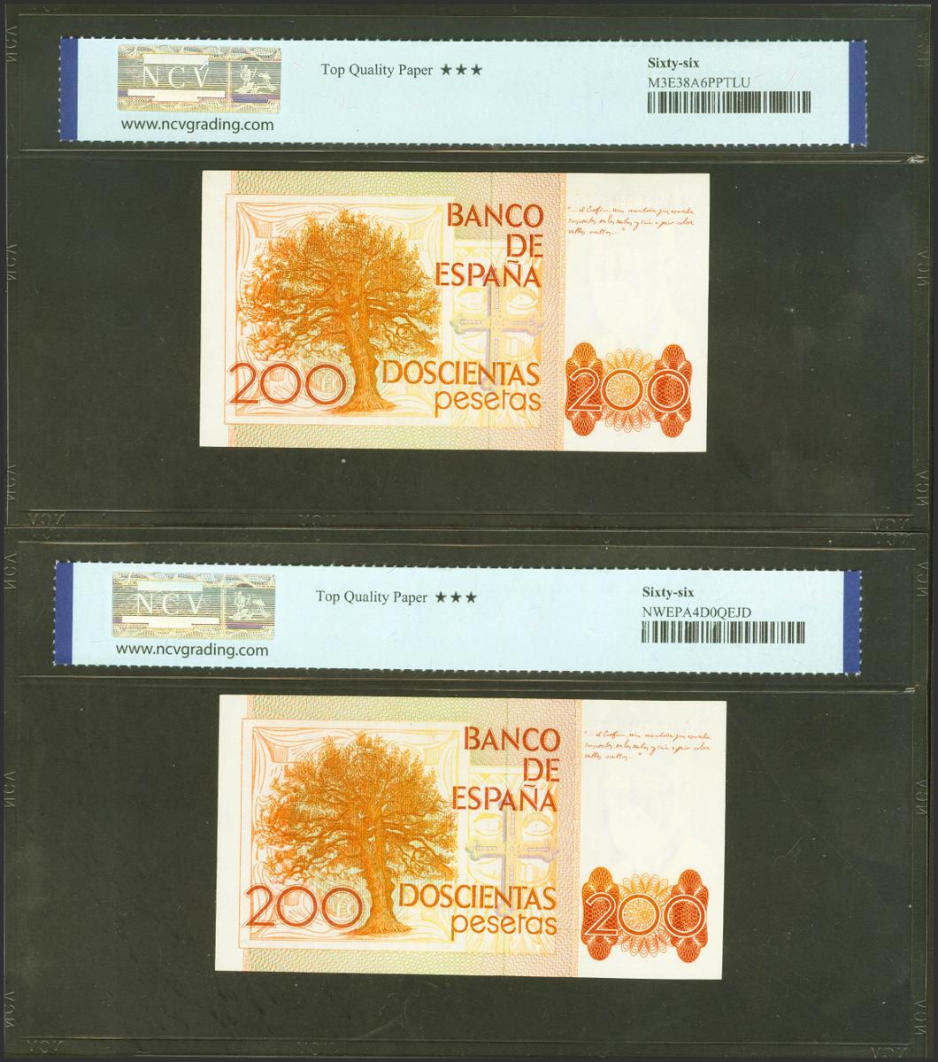 200 Pesetas. 16 de Septiembre de 1980. Pareja correlativa. Serie especial 9A. (Edifil 2021: 480b, Pick: 156*). Apresto original. SC. Encapsulados NCV66TQP, ambos.