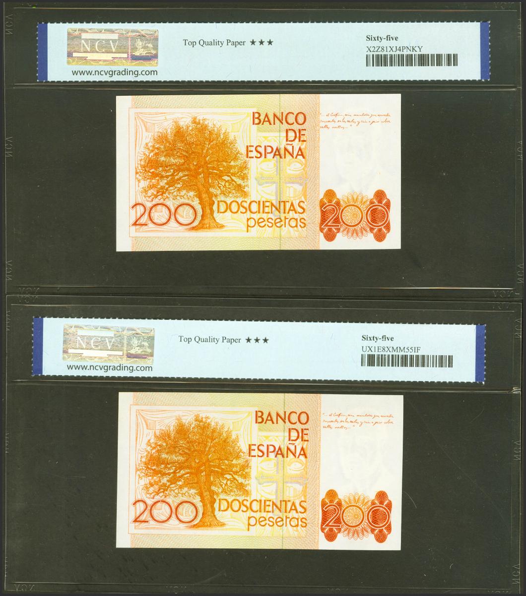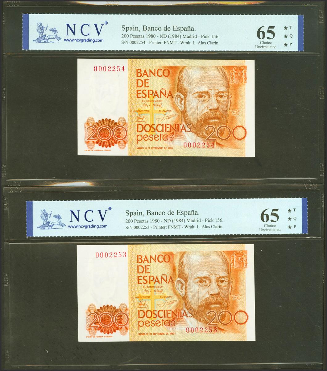 200 Pesetas. 16 de Septiembre de 1980. Pareja correlativa. Sin serie y numeracion muy baja. (Edifil 2021: 480, Pick: 156). Inusual en esta excepcional calidad. SC. Encapsulados NCV65TQP, ambos.