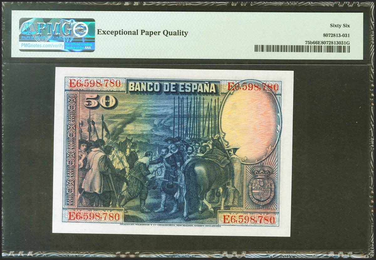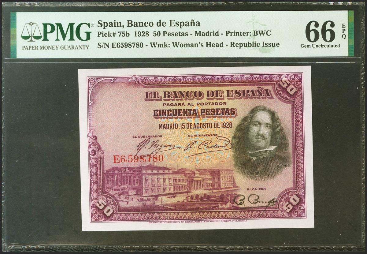 50 Pesetas. 15 de Agosto de 1928. Serie E, última serie emitida. (Edifil 2021: 354, Pick: 75b). Inusual en esta excepcional calidad, apresto original. SC. Encapsulado PMG66EPQ.