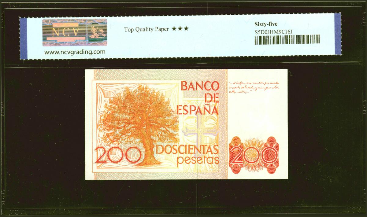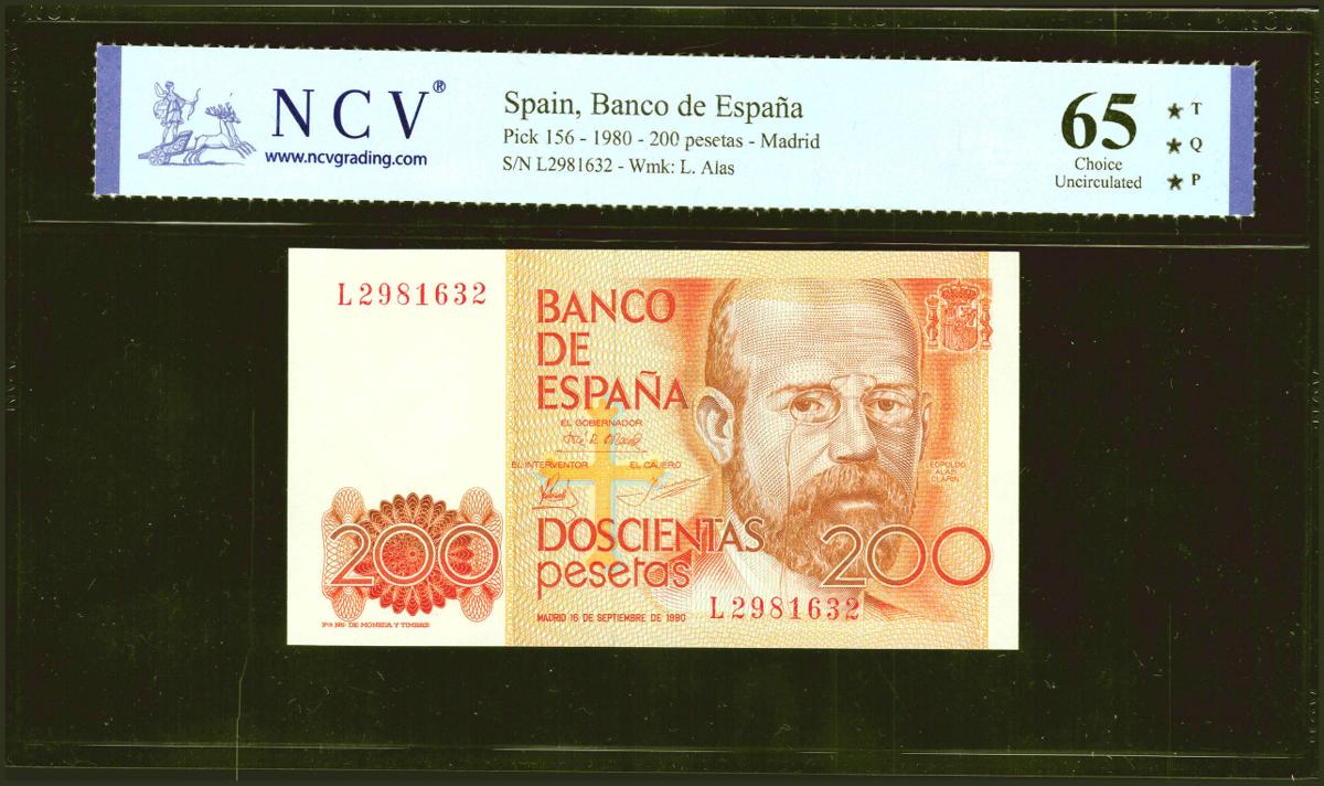200 Pesetas. 16 de Septiembre de 1980. Serie L. (Edifil 2021: 480a, Pick: 156). Apresto original. SC. Encapsulados NCV65TQP.