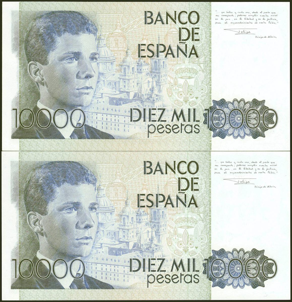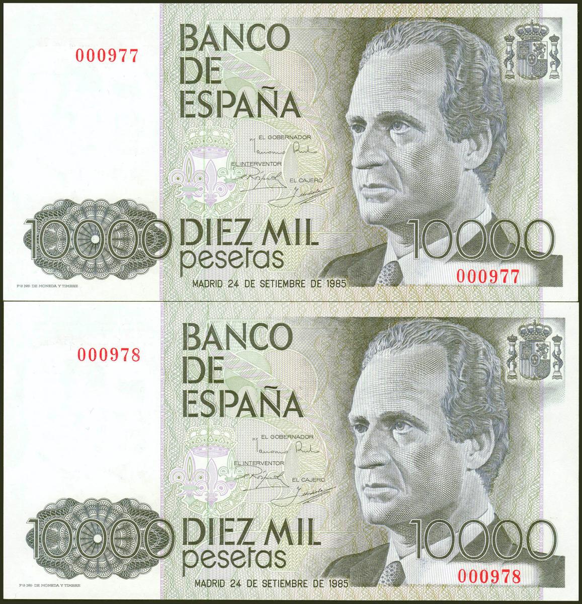 10000 Pesetas. 24 de Septiembre de 1985. Pareja correlativa. Sin serie y numeración bajísima. (Edifil 2021: 481). SC-.