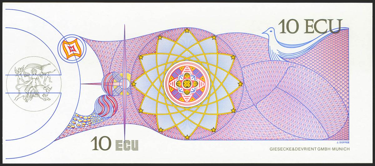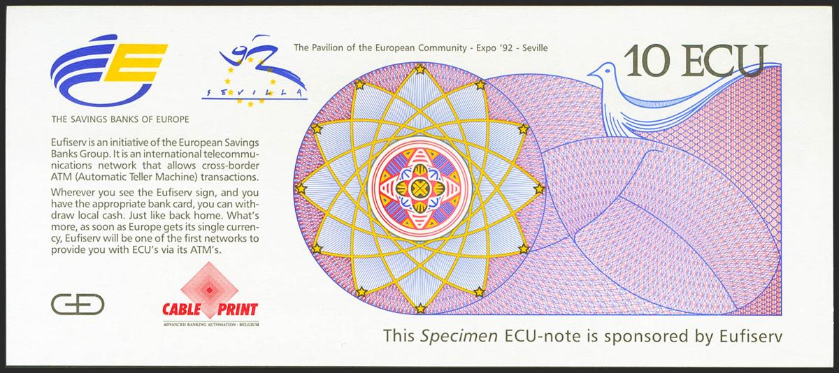 10 Ecu. 1992. SPECIMEN. Billete Promocional de la moneda única Europea, el Ecu, expuesta en el pabellón de la Comunidad Europea con motivo de la Exposición Universal de Sevilla. Muy raro. SC-.