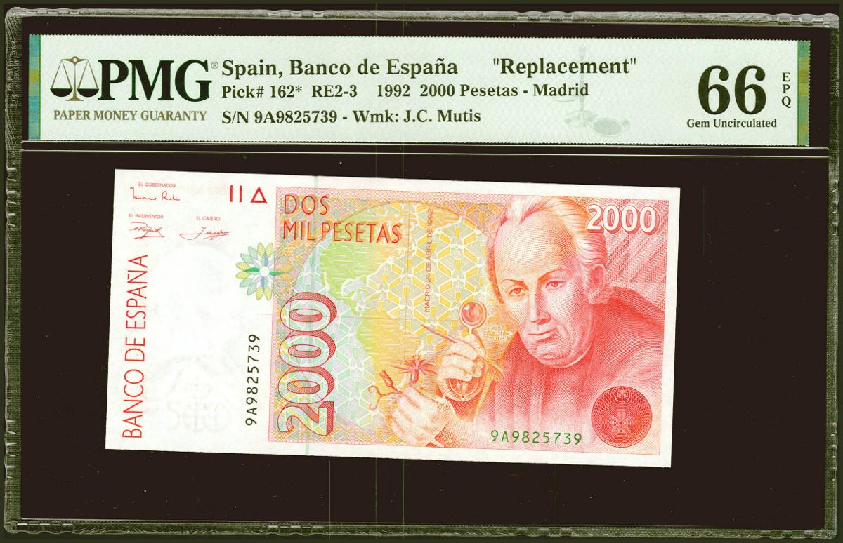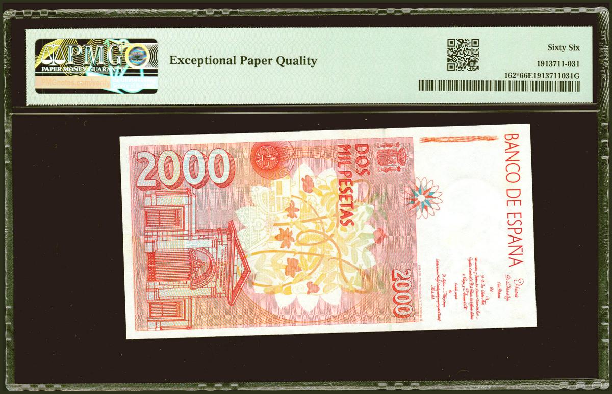 2000 Pesetas. 24 de Abril de 1992. Serie especial 9A. (Edifil 2021: 482b, Pick: 162*). Muy rara serie en esta excepcional calidad. SC. Encapsulado PMG66EPQ.