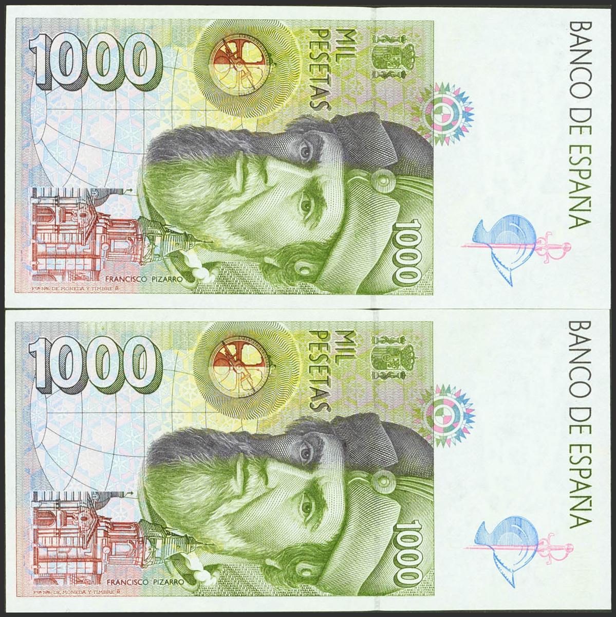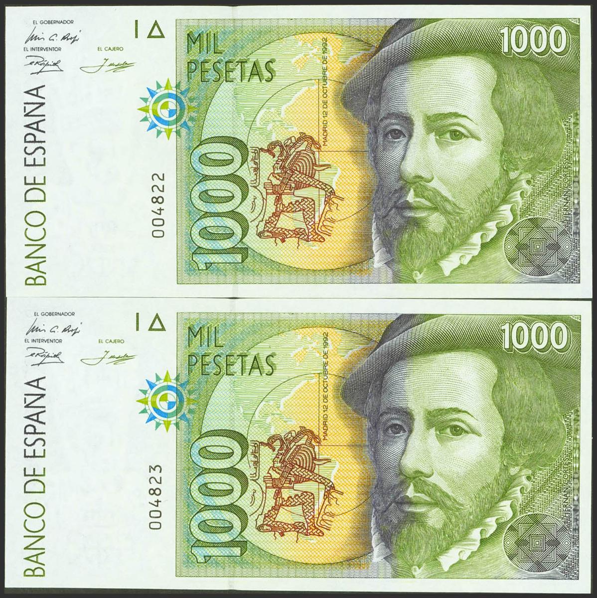 1000 Pesetas. 12 de Octubre de 1992. Pareja correlativa. Sin serie y numeración muy baja. (Edifil 2020: 483). SC.