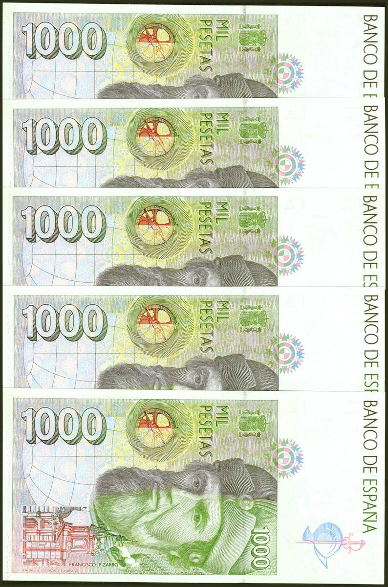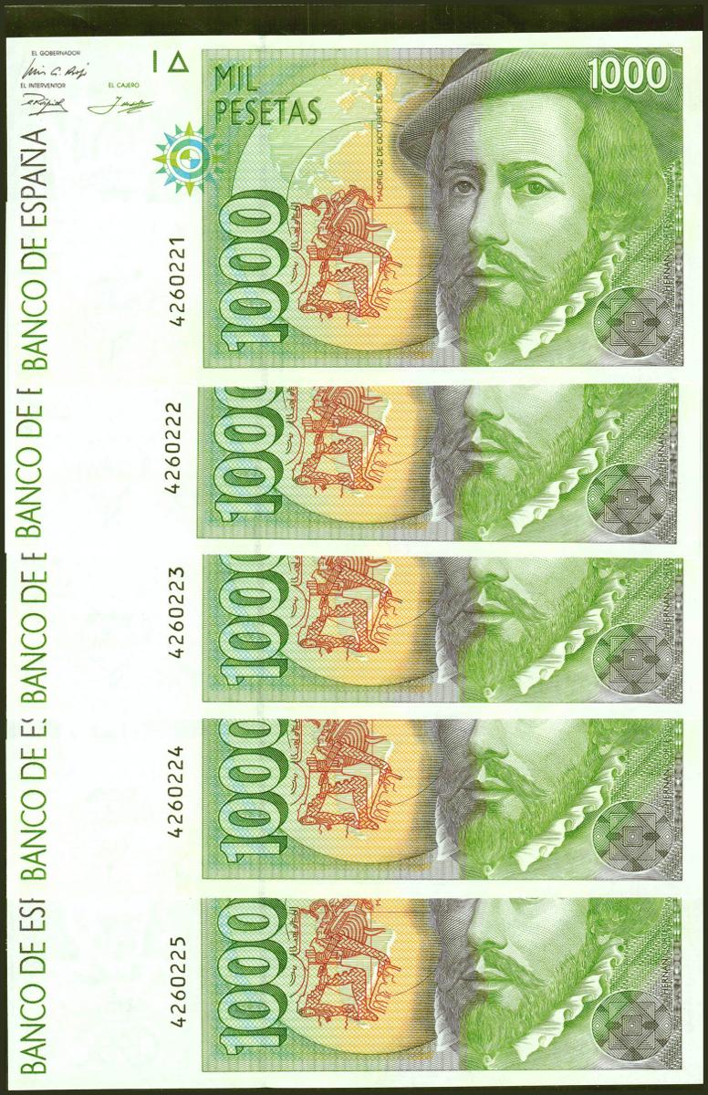 Conjunto de 5 billetes correlativos de 1000 Pesetas emitidos el 12 de Octubre de 1992, todos ellos sin serie (Edifil 2021: 483). SC.