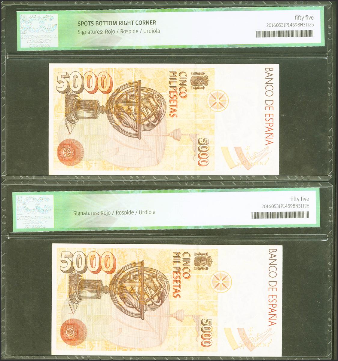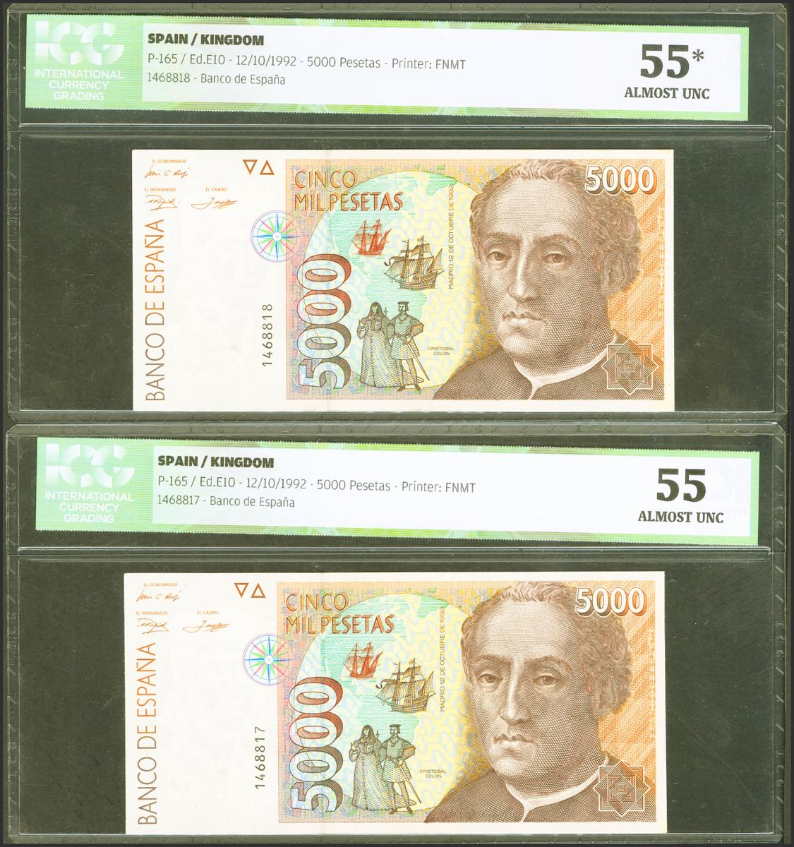5000 Pesetas. 12 de Octubre de 1992. Pareja correlativa. Sin serie. (Edifil 2021: 484). EBC+. Encapsulados ICG55, ambo.