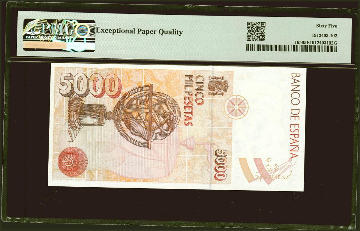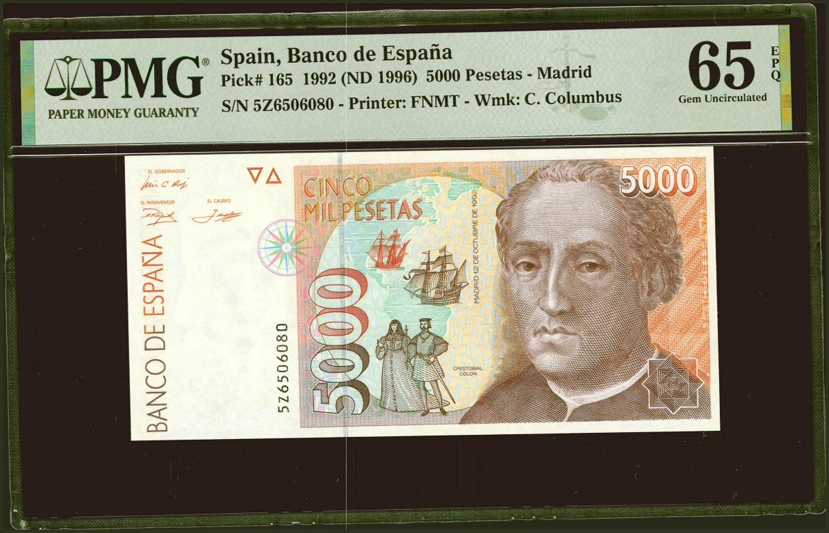 5000 Pesetas. 12 de Octubre de 1992. Serie 5Z. (Edifil 2021: 484a, Pick: 165). SC. Encapsulado PMG65EPQ.