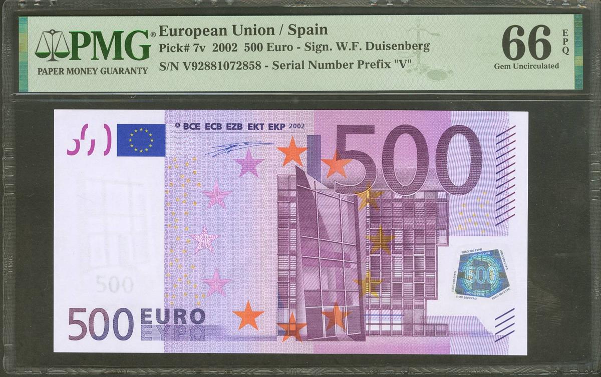 500 Euros. 1 de Enero de 2002. Firma Duisenberg. Serie V (España). (Edifil 2021: 492, Pick: 7v). SC. Encapsulado PMG66EPQ.