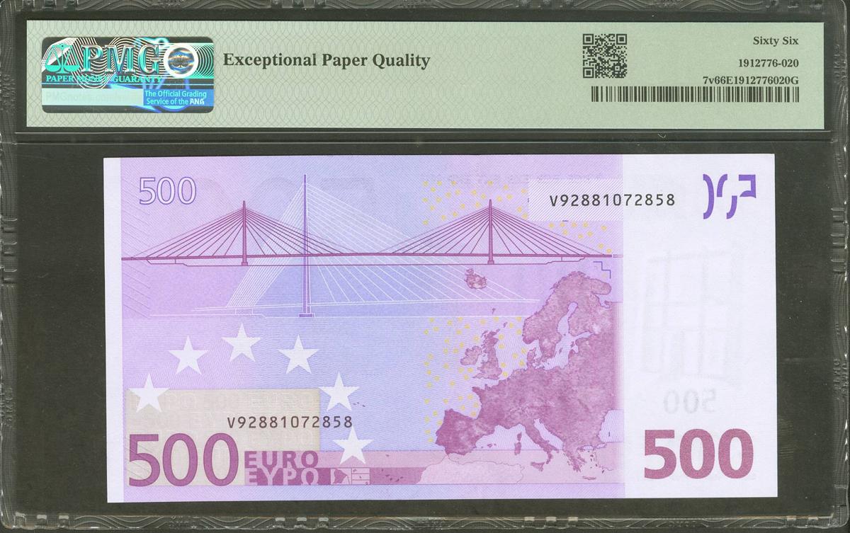 500 Euros. 1 de Enero de 2002. Firma Duisenberg. Serie V (España). (Edifil 2021: 492, Pick: 7v). SC. Encapsulado PMG66EPQ.