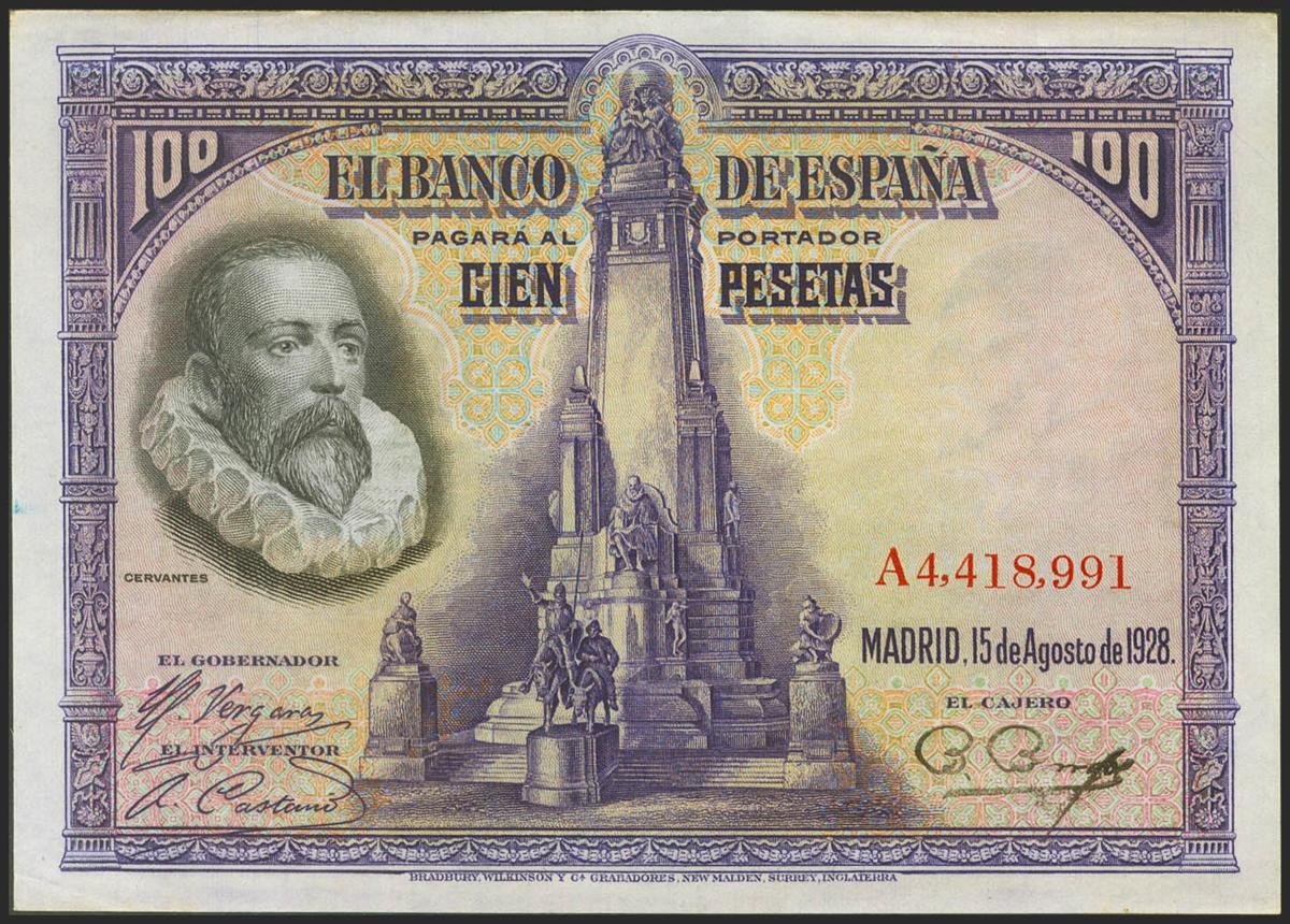 100 Pesetas. 15 de Agosto de 1928. Serie A. (Edifil 2021: 355a). Conserva gran parte de su apresto original. EBC+.
