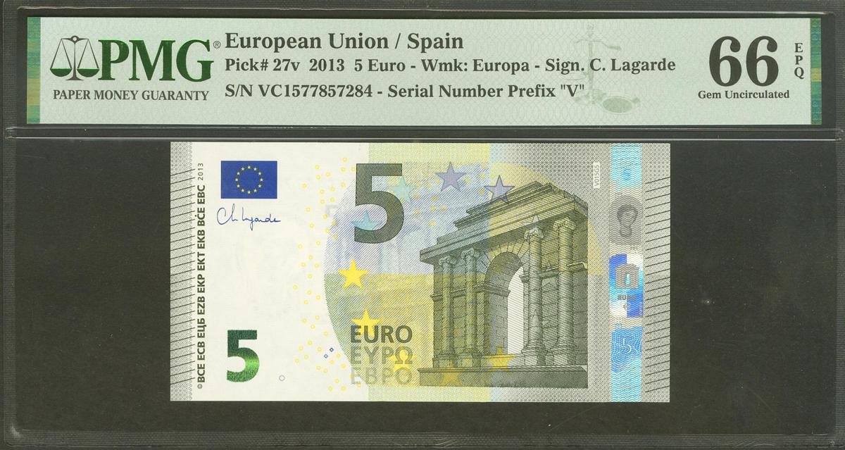 5 Euros. 2 de Mayo de 2013. Firma Lagarde. Serie V (España). (Edifil 2021: 493A, Pick: 27v). Apresto original. SC. Encapsulado PMG66EPQ.