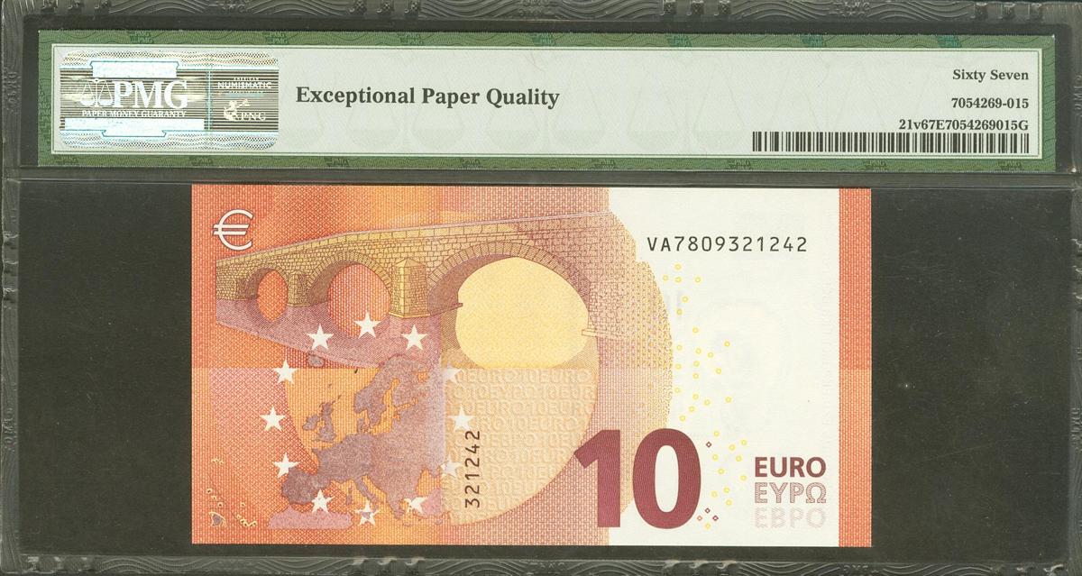 10 Euros. 23 de Septiembre de 2014. Firma Draghi. Serie V (España). (Edifil 2021: 494, Pick: 21v). SC. Encapsulado PMG67EPQ.