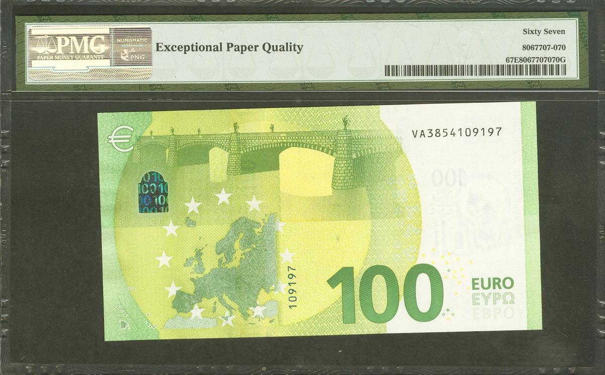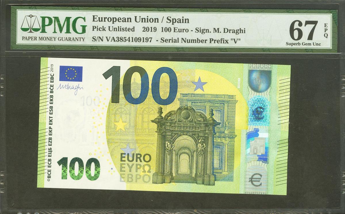 100 Euros. 28 de Mayo de 2019. Firma Draghi. Serie V (España). (Edifil 2021: 497, Pick: 24v). SC. Encapsulado PMG67EPQ.