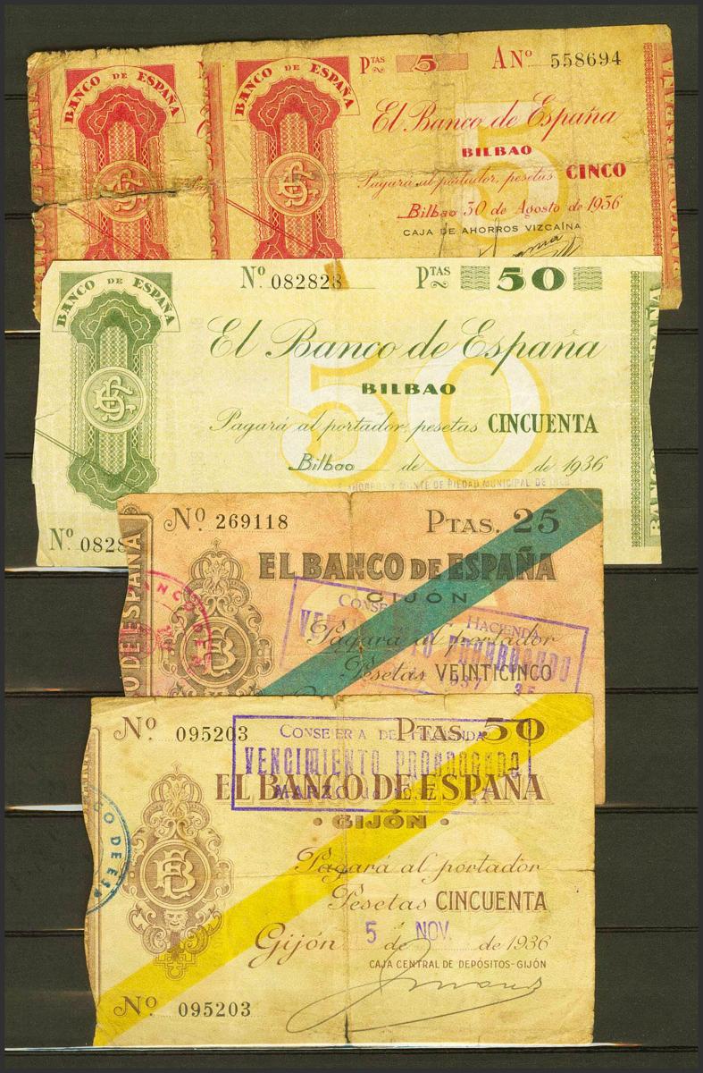 Conjunto de billetes del Banco de España, la mayoría del Banco de Bilbao (incluye un trío correlativo y una pareja correlativa y una pareja muy próxima en sus numeraciones), en diversas calidades y una pareja correlativa (sin desprender) del 20 Centavos de Cuba española con la sobrecarga PLATA dudosa. A EXAMINAR.