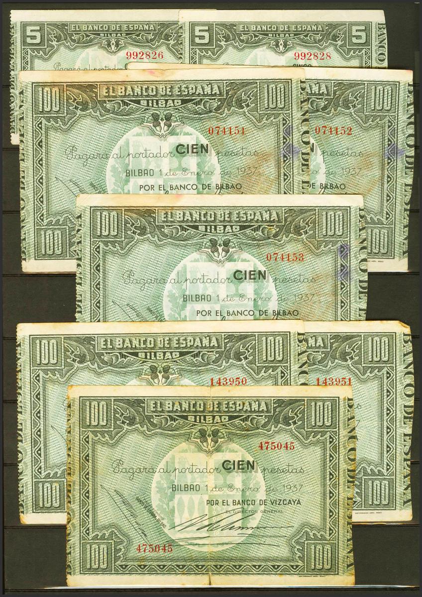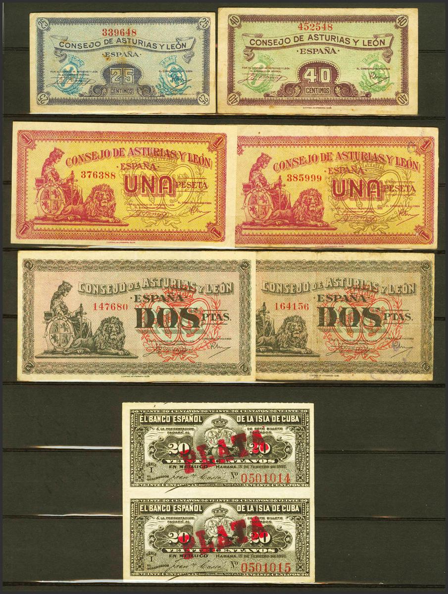 Conjunto de billetes del Banco de España, la mayoría del Banco de Bilbao (incluye un trío correlativo y una pareja correlativa y una pareja muy próxima en sus numeraciones), en diversas calidades y una pareja correlativa (sin desprender) del 20 Centavos de Cuba española con la sobrecarga PLATA dudosa. A EXAMINAR.