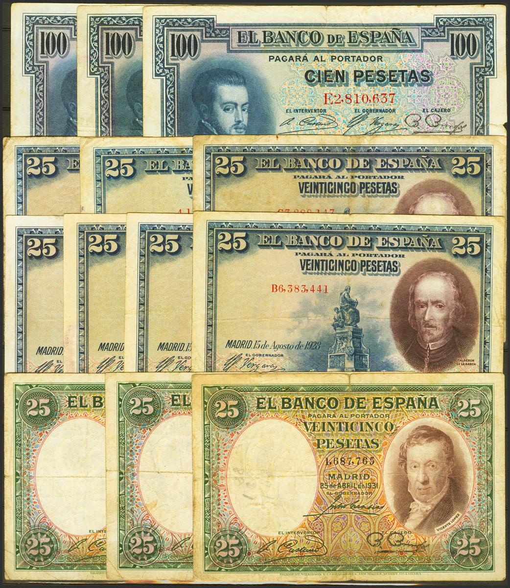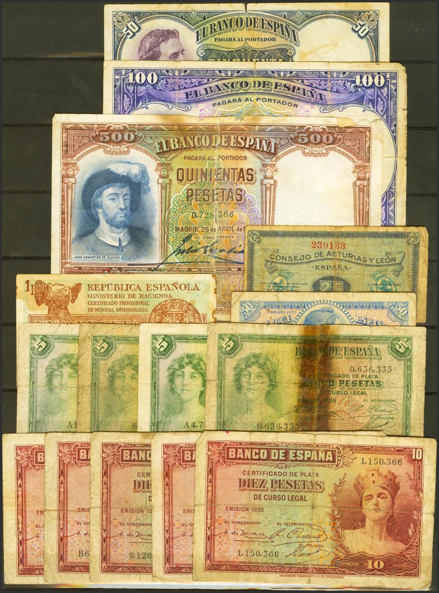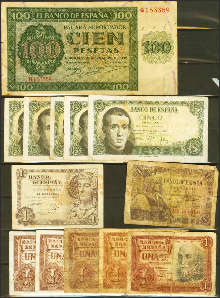 Conjunto de más de 60 billetes del Banco de España, de diversas emisiones, en calidades pobres y cantidades diversas. A EXAMINAR.