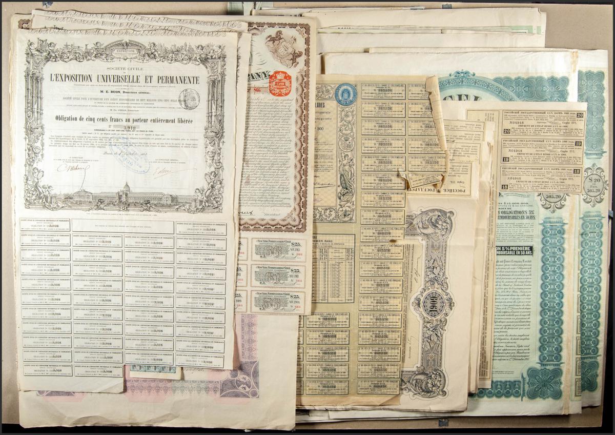 BONOS Y ACCIONES. Interesante y amplia colección de bonos y acciones extranjeras de los siglos XIX y XX y de países tan dispares como Rusia, Costa Rica, Argentina, México, Francia o Uruguay entre otros. Podemos encontrar documentación tanto de bancos (Banco de Crédito Mexicano, Banco Español de la Isla de Cuba, Constructor de la Plata, etc) como de empresas públicas y privadas: Canal de Panamá, empresas mineras, compañías extranjeras pero con concesiones en España (como la londinense de ferrocarriles Railway Alcoy and Gandía Harbour o la minera Arnoya Mining Company), Empresas o Negociaciones Agrícolas etc. Diferentes estados de conservación. A EXAMINAR.
