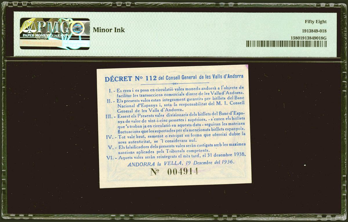 ANDORRA. 1 Pesseta. 19 de Diciembre de 1936. Sin serie. (Edifil 2021: 2, Pick: 1). Inusual en esta calidad. EBC++. Encapsulado PMG58 (minor ink).
