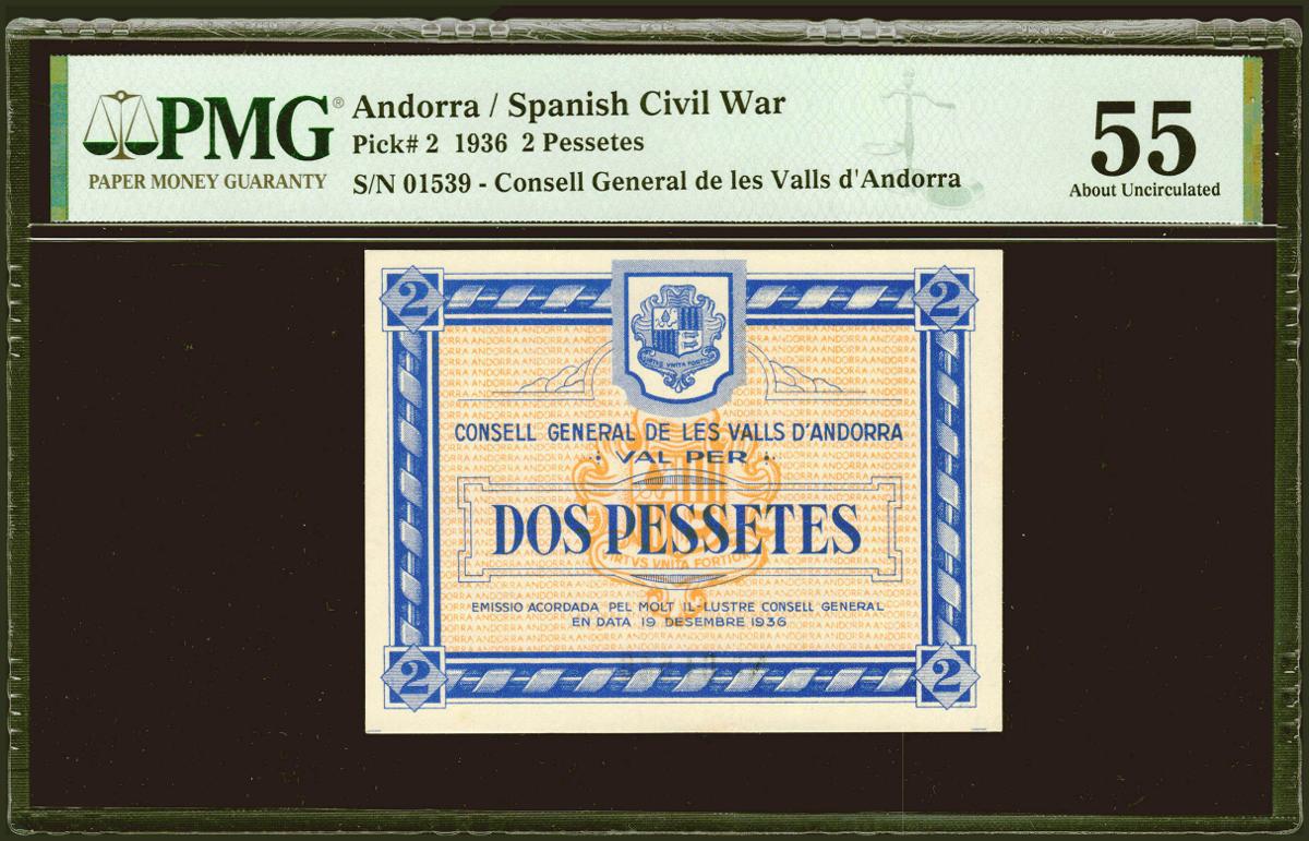 ANDORRA. 2 Pessetas. 19 de Diciembre de 1936. Sin serie. (Edifil 2021: 4, Pick: 2). Raro. EBC+. Encapsulado PMG55.