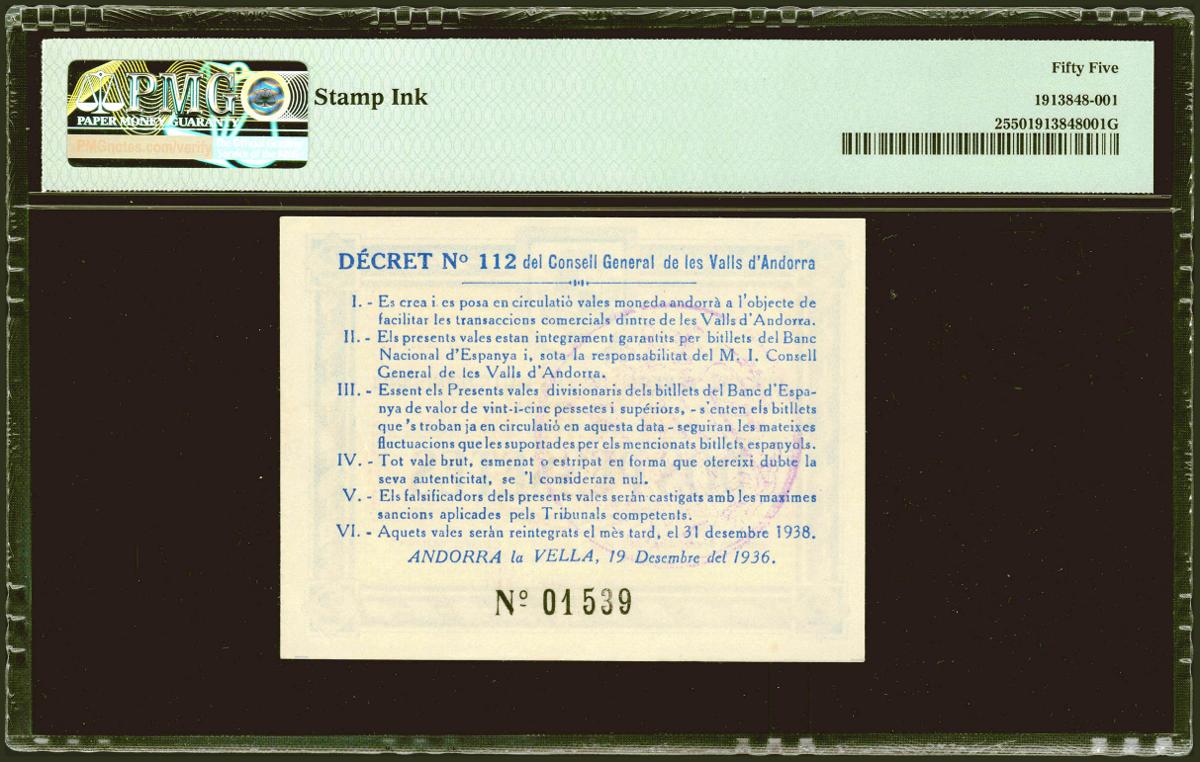 ANDORRA. 2 Pessetas. 19 de Diciembre de 1936. Sin serie. (Edifil 2021: 4, Pick: 2). Raro. EBC+. Encapsulado PMG55.