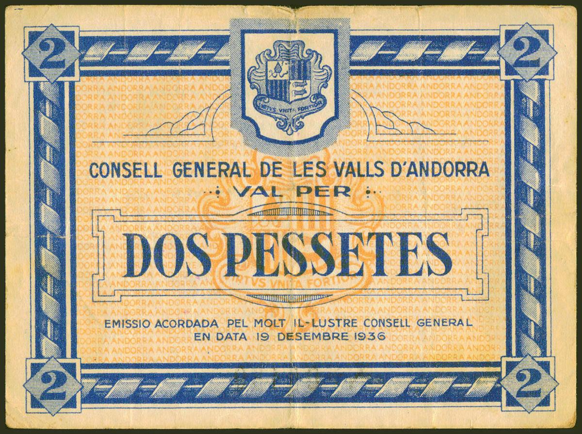 ANDORRA. 2 Pessetas. 19 de Diciembre de 1936. Sin serie. (Edifil 2021: 4, Pick: 2). Raro. MBC+