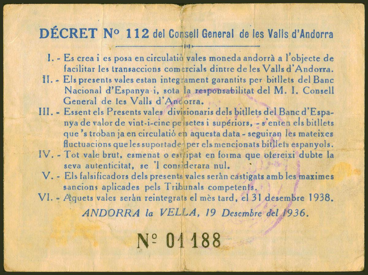ANDORRA. 2 Pessetas. 19 de Diciembre de 1936. Sin serie. (Edifil 2021: 4, Pick: 2). Raro. MBC+