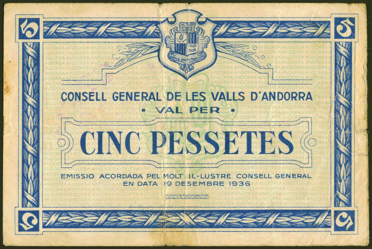ANDORRA. 5 Pessetes. 19 de Diciembre de 1936. Sin serie. (Edifil 2021: 6, Pick: 3). Rarísimo. MBC.