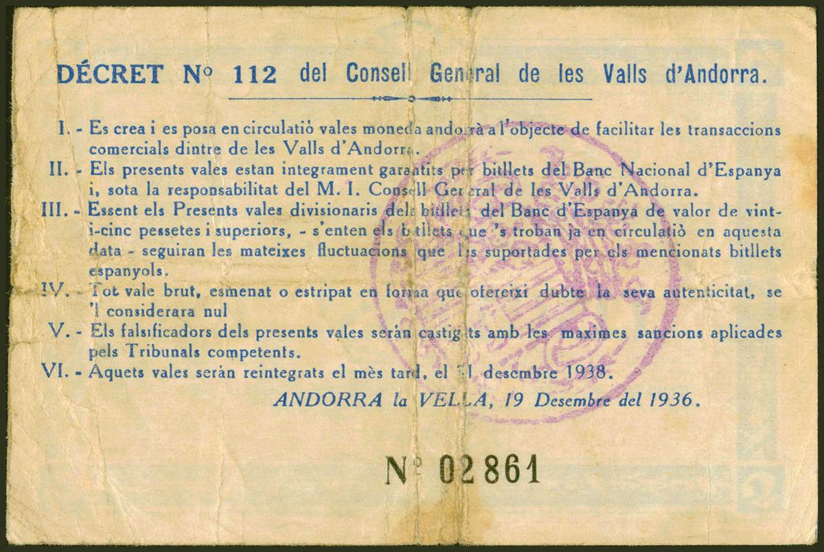 ANDORRA. 5 Pessetes. 19 de Diciembre de 1936. Sin serie. (Edifil 2021: 6, Pick: 3). Rarísimo. MBC.