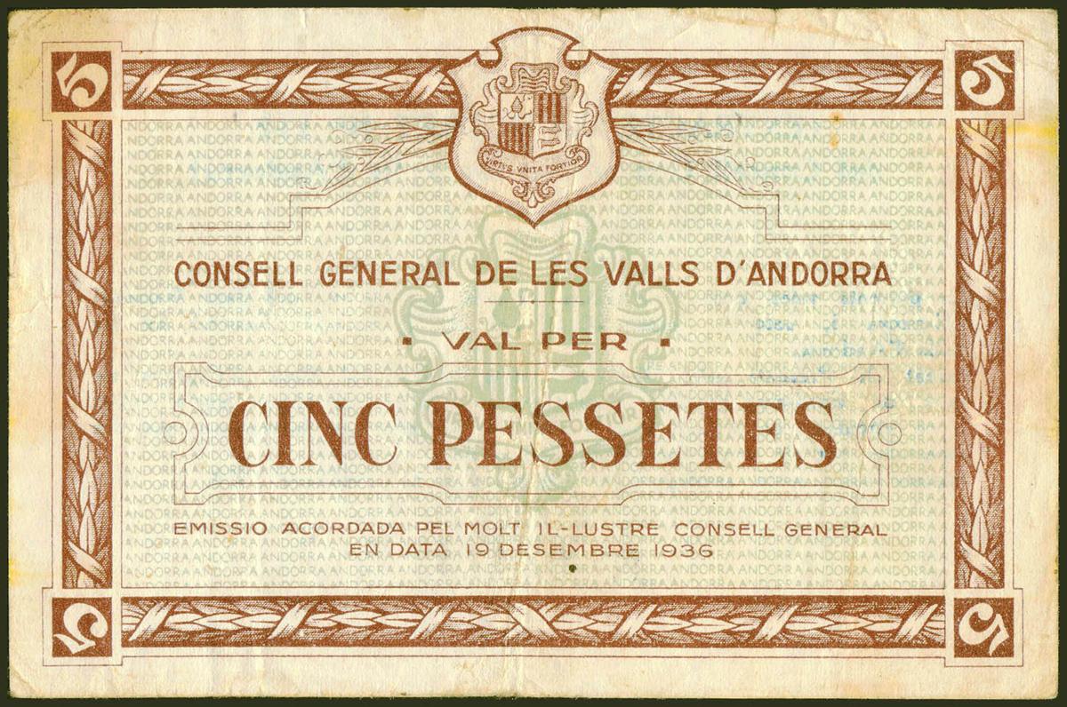 ANDORRA. 5 Pessetes. 19 de Diciembre de 1936. (Edifil 2021: 7, Pick: 8). Raro. MBC.