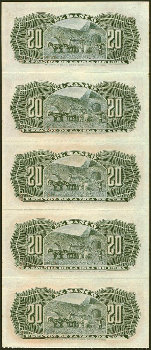 BANCO ESPAÑOL DE LA ISLA DE CUBA. Conjunto de 5 billetes correlativos de 20 Centavos (sin desprender), emitidos el 15 de Febrero de 1897. Serie I. (Edifil 2021: 85, Pick: 53a). Apresto original. SC.