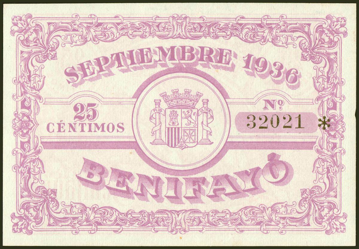 BENIFAYO (VALENCIA). 25 Céntimos. (1936ca). (González: 1112). SC-.
