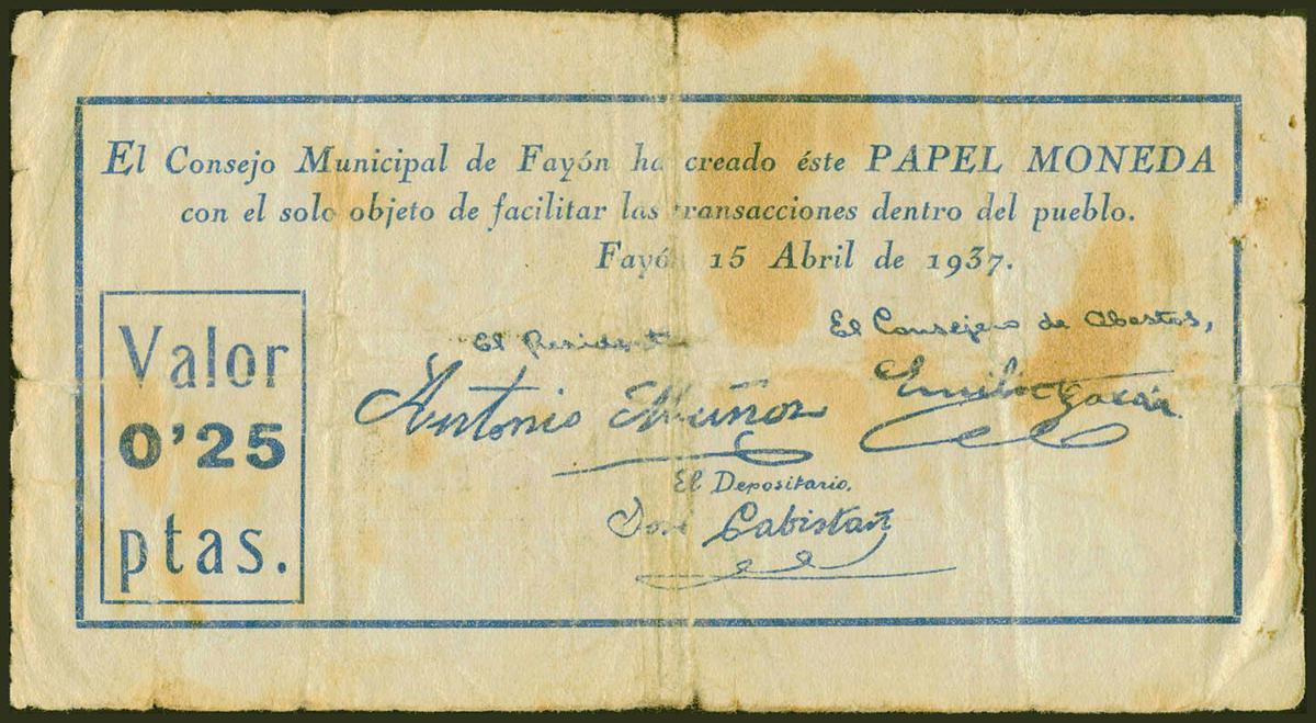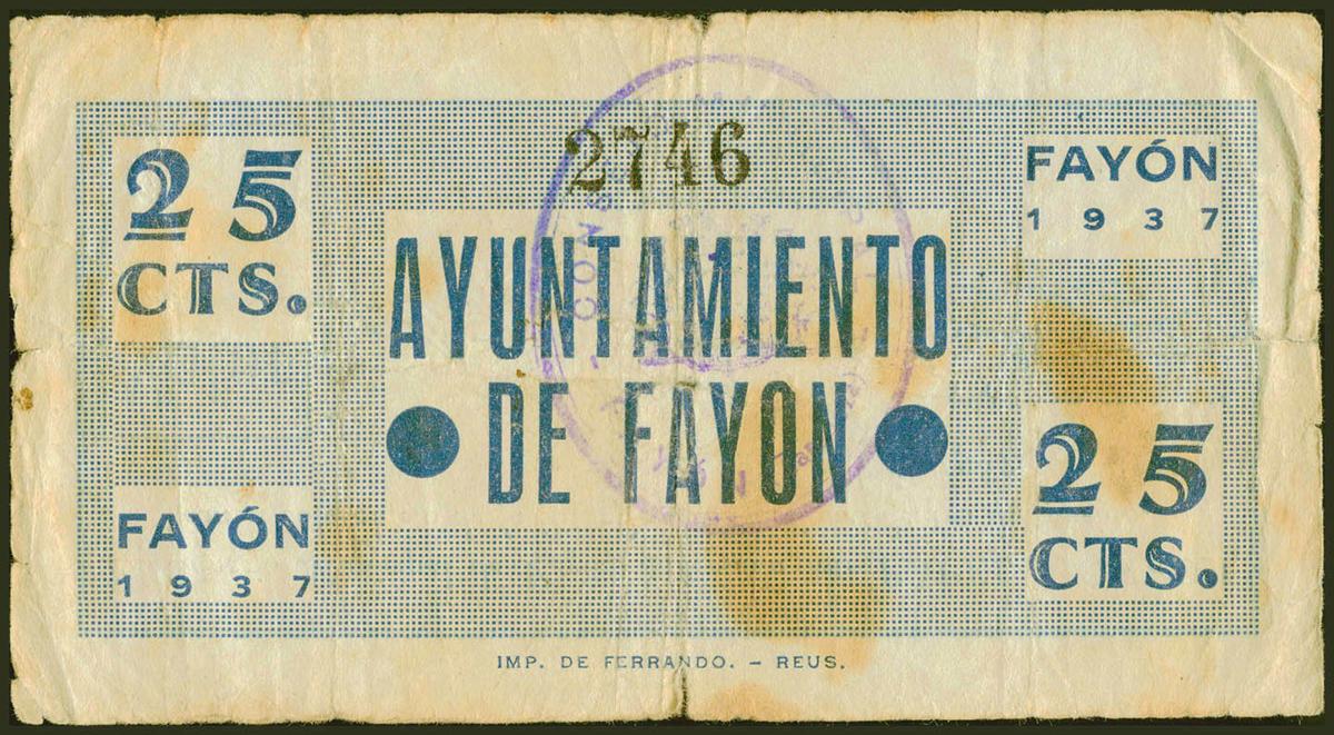 FAYON (ZARAGOZA). 25 Céntimos. 15 de Abril de 1937. (González: 2415). Muy raro. MBC-.