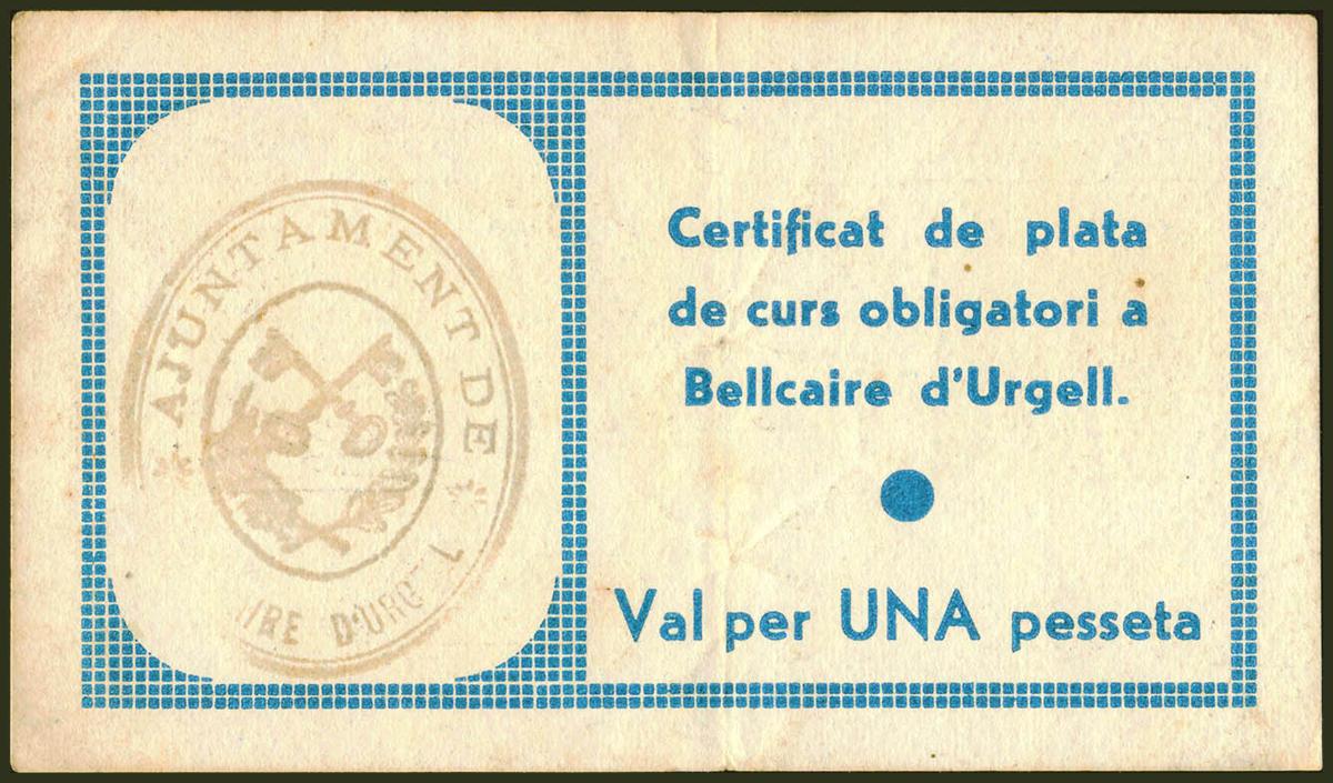 BELLCAIRE D´URGELL (LERIDA). 1 Peseta. 4 de Enero de 1937. (González: 6970). MBC.