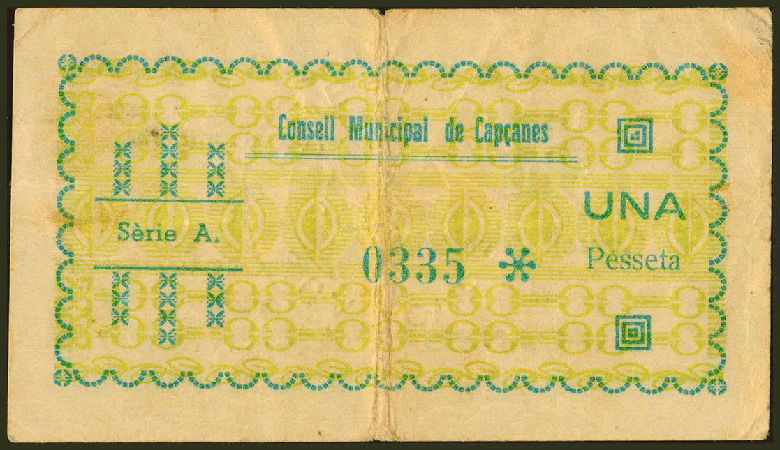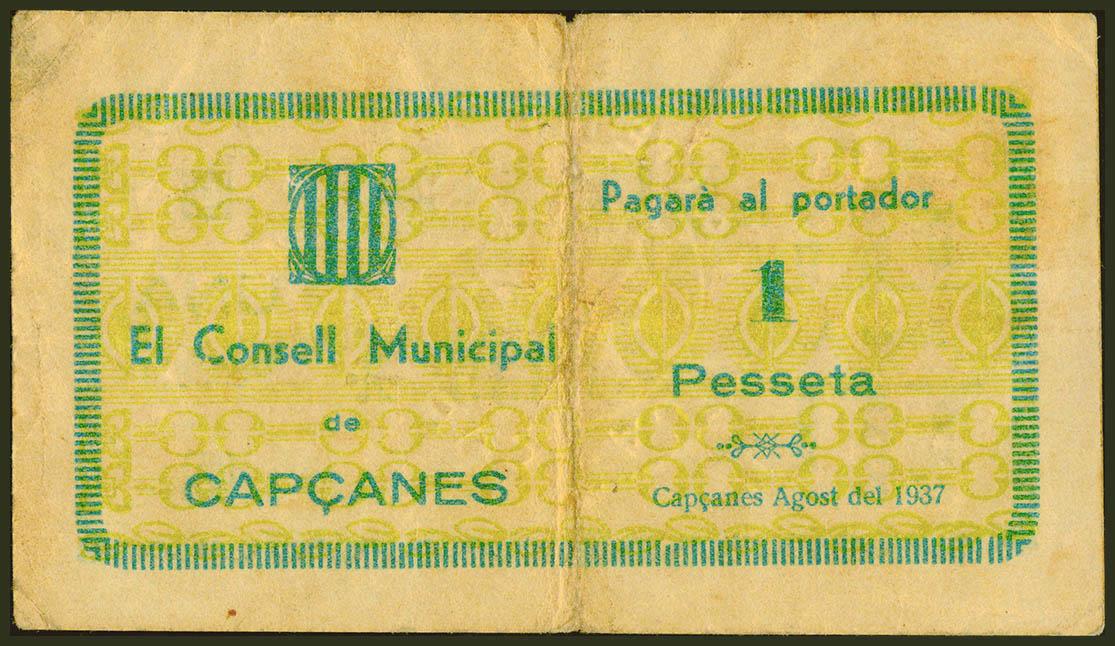 CAPCANES (TARRAGONA). 1 Peseta. Agosto 1937. Serie A. (González: 7368). Raro. MBC.