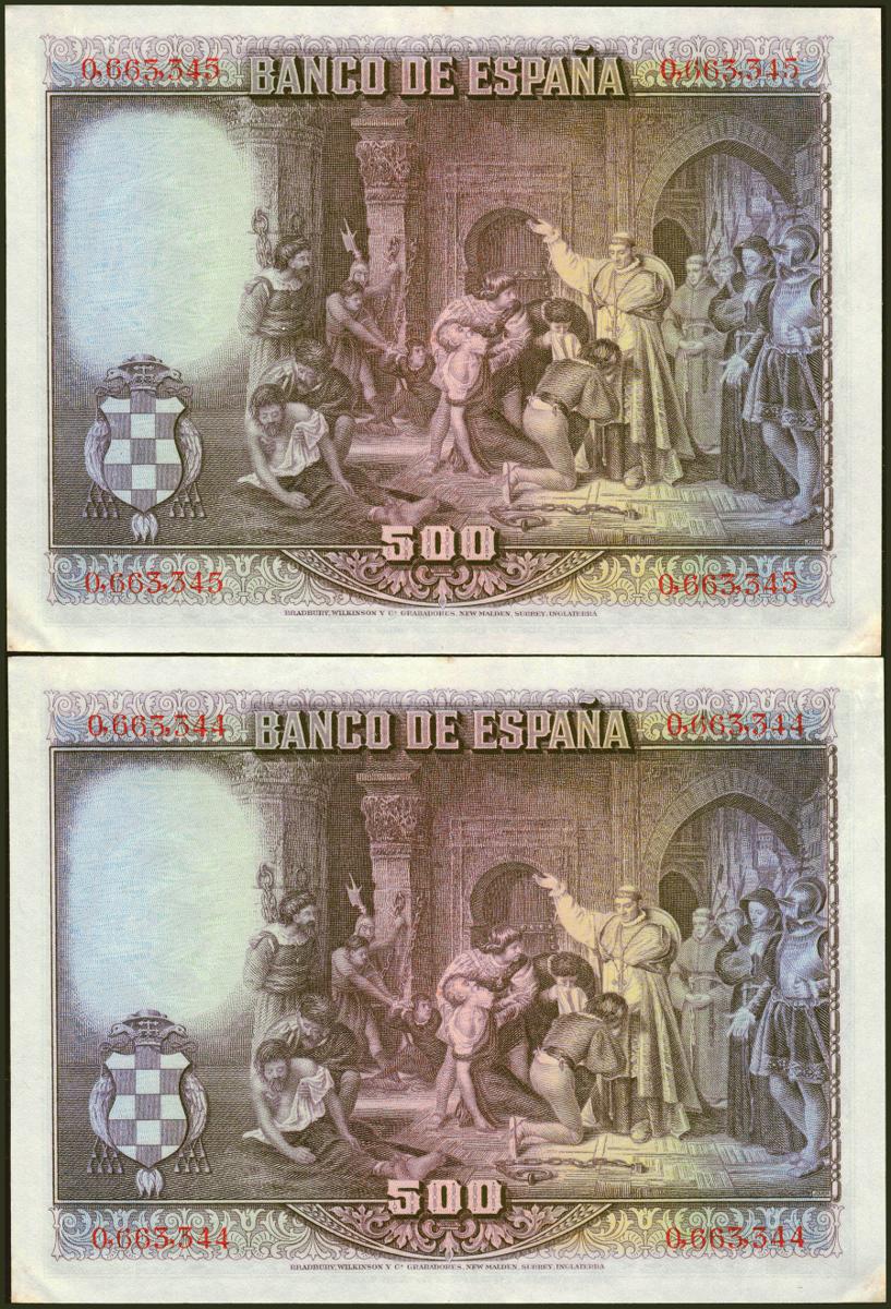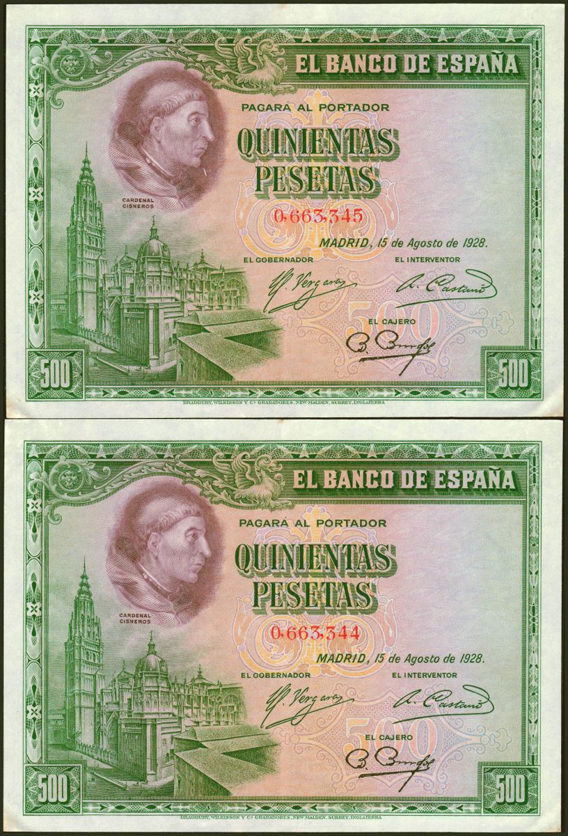 500 Pesetas. 15 de Agosto de 1928. Pareja correlativa. Sin serie. (Edifil 2021: 356). Conserva parte de su apresto original. EBC.