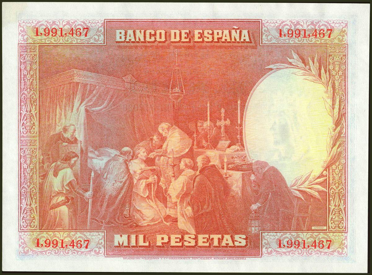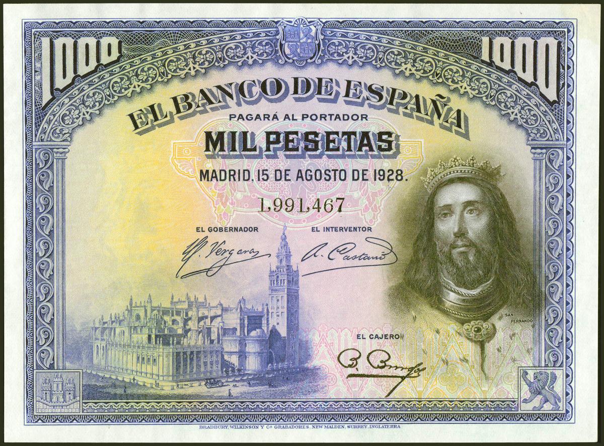 1000 Pesetas. 15 de Agosto de 1928. Sin serie. (Edifil 2021: 357). Manchita del tiempo en la esquina derecha superior, conserva todo su apresto original. SC-.