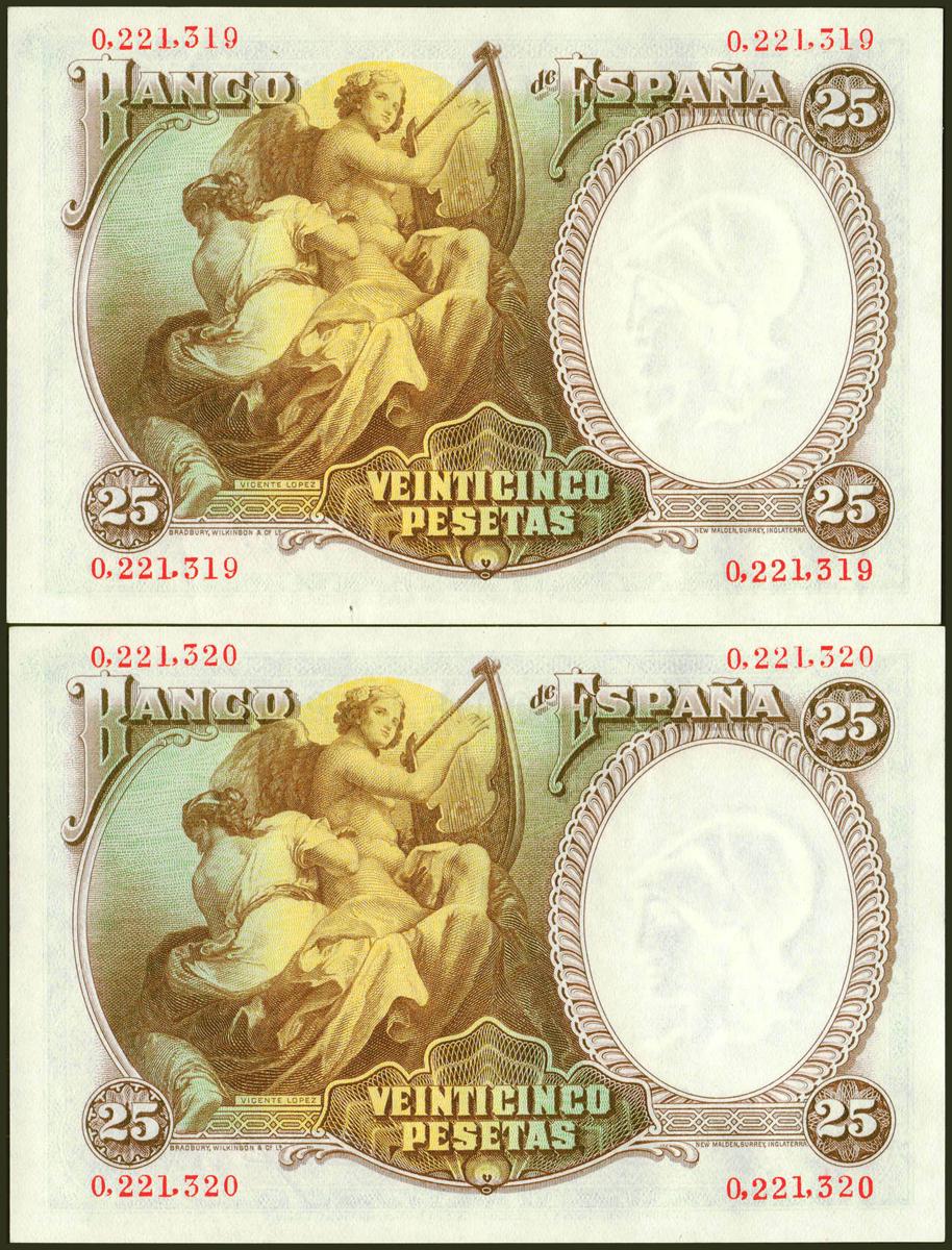 25 Pesetas. 25 de Abril de 1931. Pareja correlativa. Sin serie. (Edifil 2021: 358). Conserva todo su apresto original. SC-.