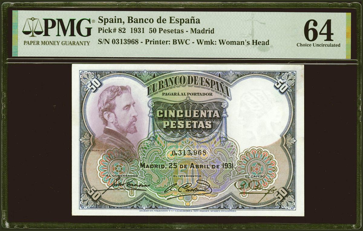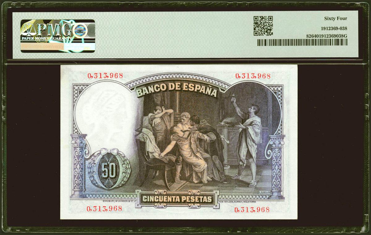 50 Pesetas. 25 de Abril de 1931. Sin serie. (Edifil 2021: 359, Pick: 82). SC. Encapsulado PMG64.