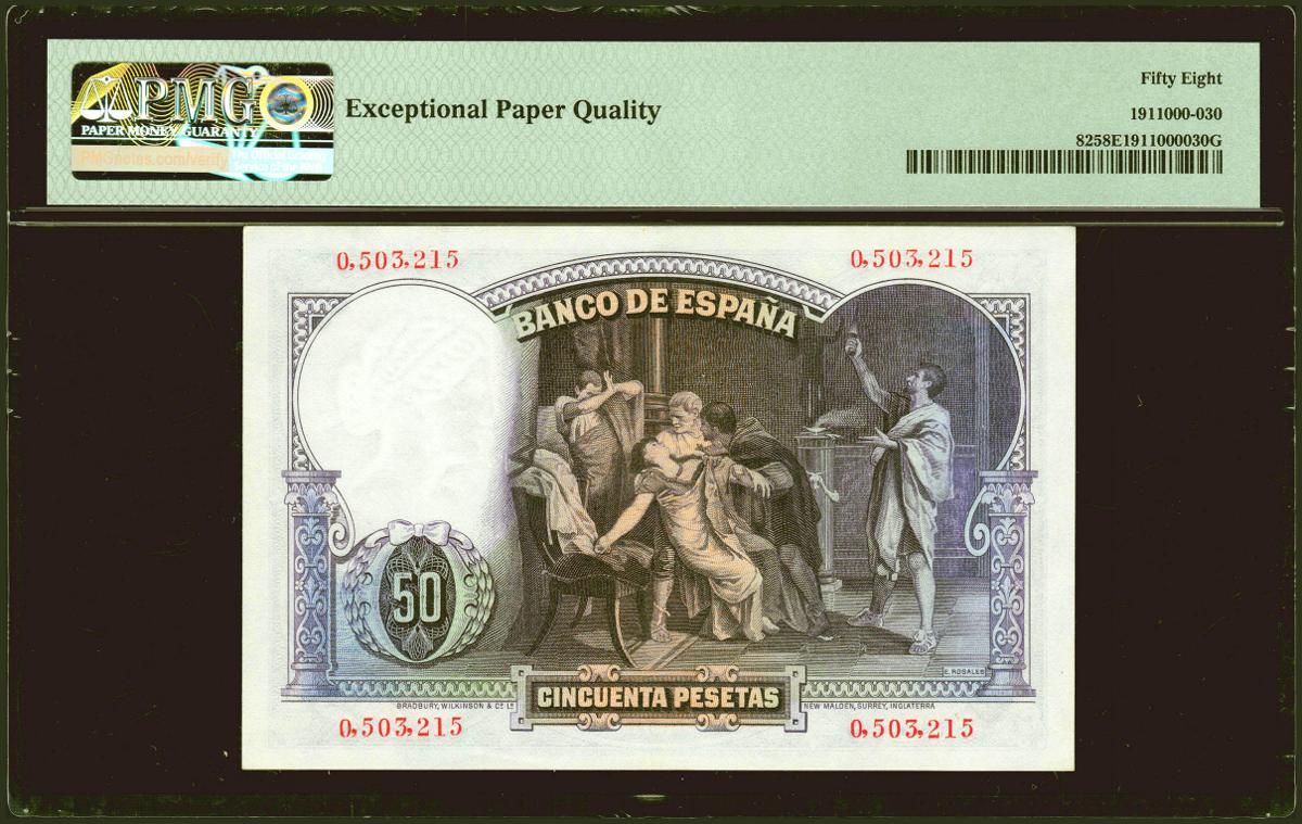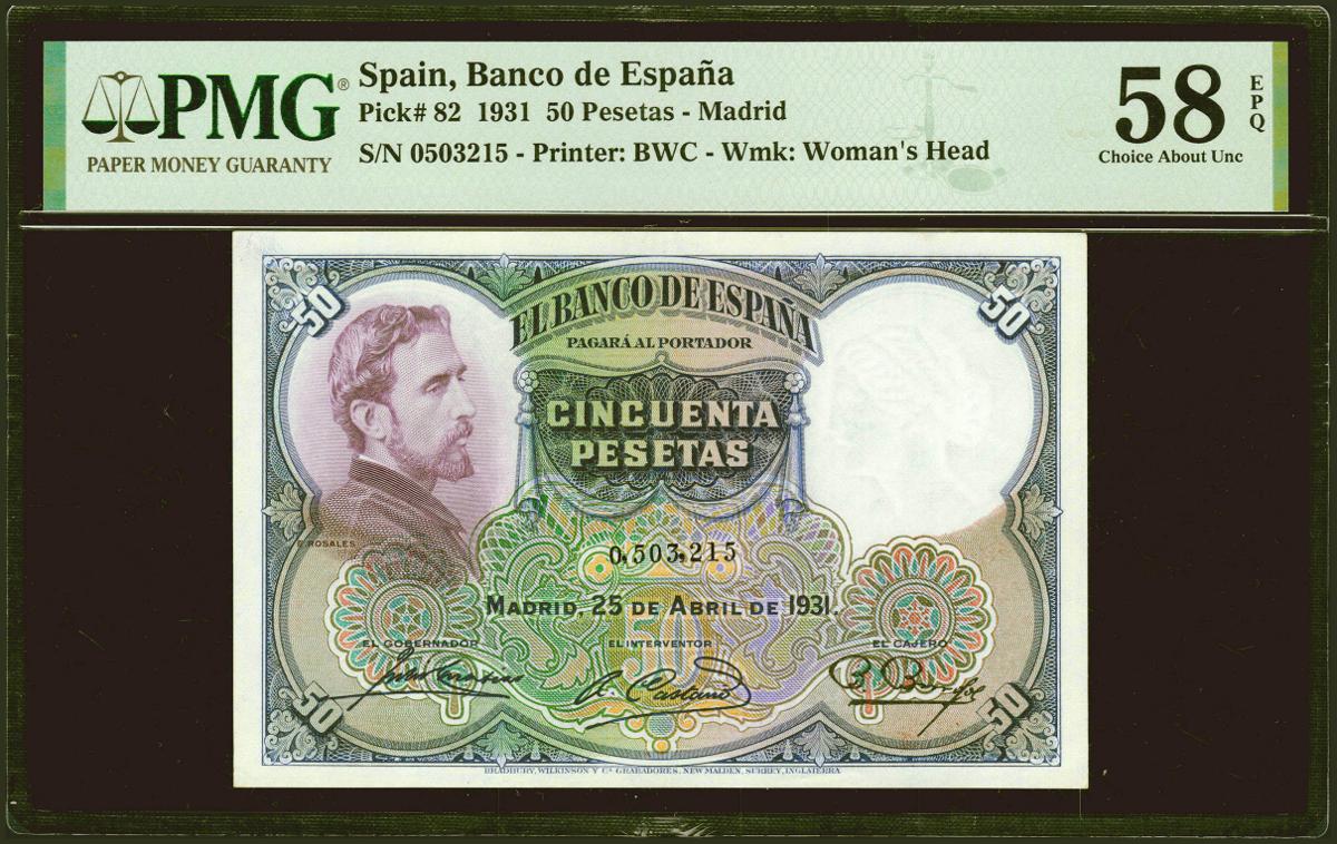 50 Pesetas. 25 de Abril de 1931. Sin serie. (Edifil 2021: 359, Pick: 82). Apresto original. EBC+++. Encapsulado PMG58EPQ.