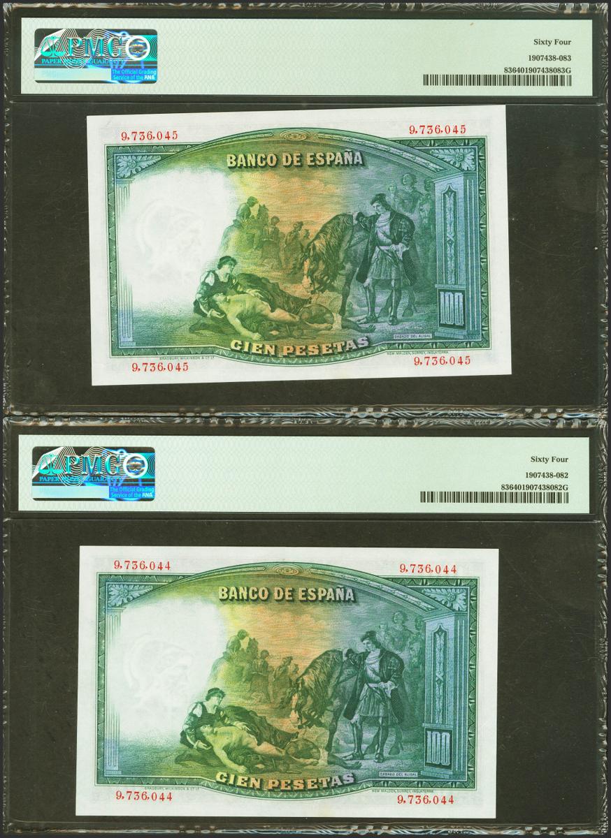100 Pesetas. 25 de Abril de 1931. Pareja correlativa. Sin serie. (Edifil 2021: 360, Pick: 83). SC. Encapsulados PMG64, ambos.