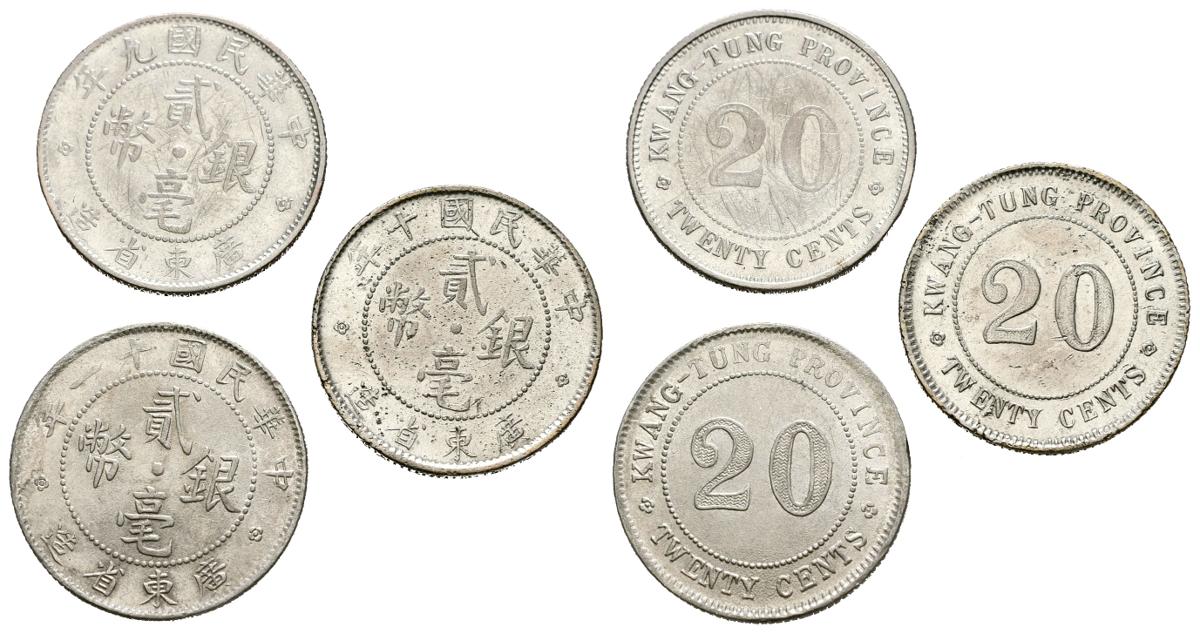 CHINA. Conjunto de 3 monedas de 20 Cents acuñadas en plata en los años 9,10 y 11 en la región de Kwang-Tung. Diferentes estados de conservación. A EXAMINAR.