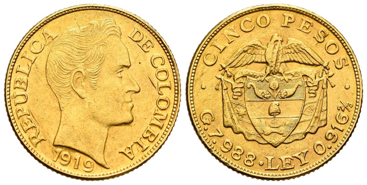 COLOMBIA. 5 Pesos. (Au. 7,99g/22mm). 1919. (Km#201). EBC-.